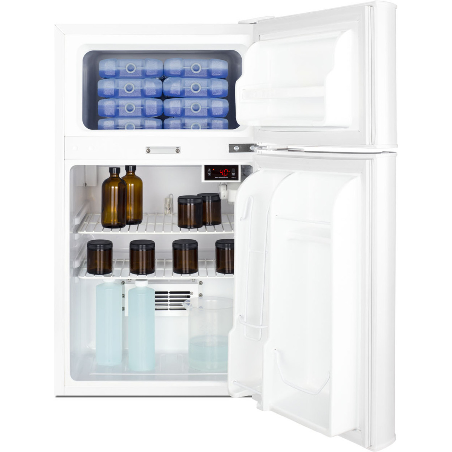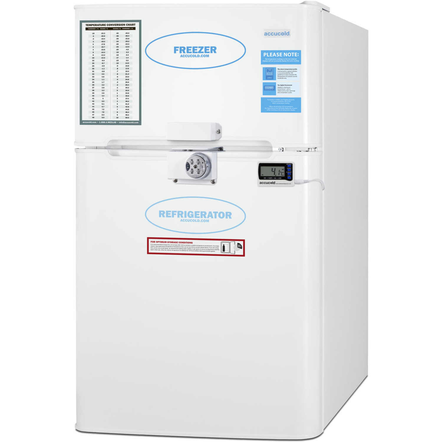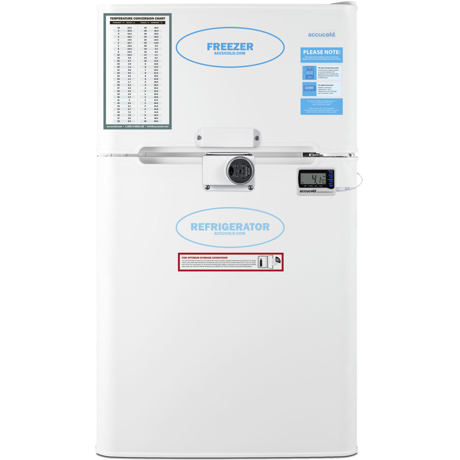 The AGP34RFLCAL is a two-door counter height refrigerator-freezer in a slim 19" footprint, ideal for offices and institutions with limited floor space. A factory-installed lock secures both sections with a user-set combination, with two keys included to override the combination if needed. The lower refrigerator compartment is designed to operate between 2 and 8ºC, with a digital thermostat that allows you to control the temperature without opening the door. We include an alarm/thermometer that users can easily install to monitor the refrigerator temperature. This temperature monitoring device is calibrated to NIST standards in our ISO/IEC 17025:2017 accredited calibration laboratory and ships with a 2-year certificate for your records. The thermometer displays the current and high/low temperatures to the nearest tenth of a degree in a readout switchable from Celsius to Fahrenheit. The temperature probe is encased in a glycol-filled bottle to help simulate the temperature of stored materials, rather than the refrigerator air temperature. An audible alarm warns if the unit has gone out of the recommended range.