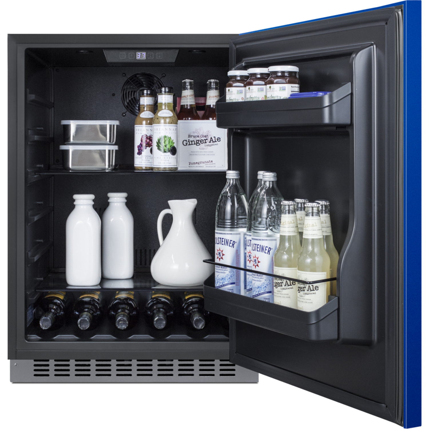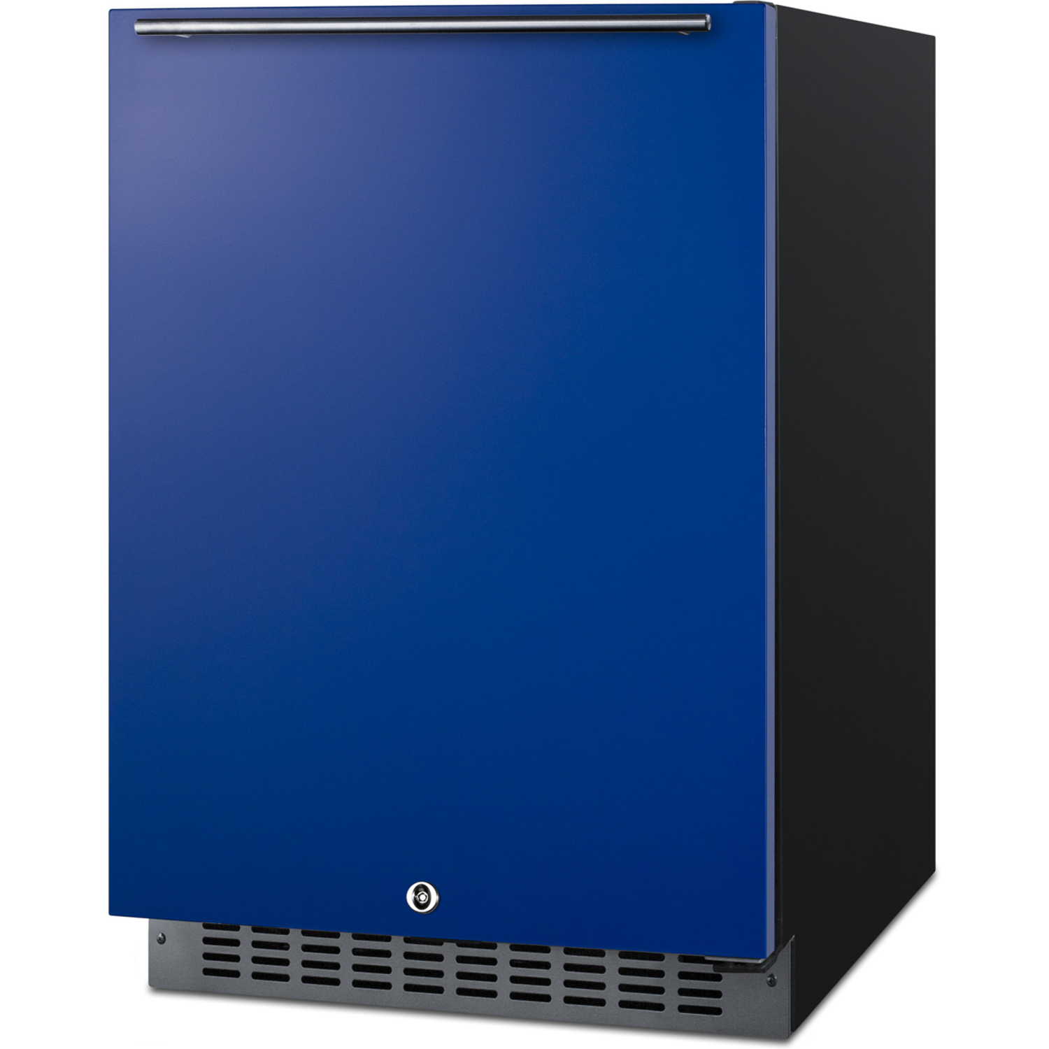 Model AL54B is a 24" wide refrigerator sized at just 32" high for easy installation under lower ADA compliant counters. The front-breathing cooling system allows built-in use, while the fully finished black cabinet also enables freestanding applications. The door finish comes in a striking cobalt blue, with a sleek horizontally mounted stainless steel handle and matching stainless steel kickplate to complete the unique look.