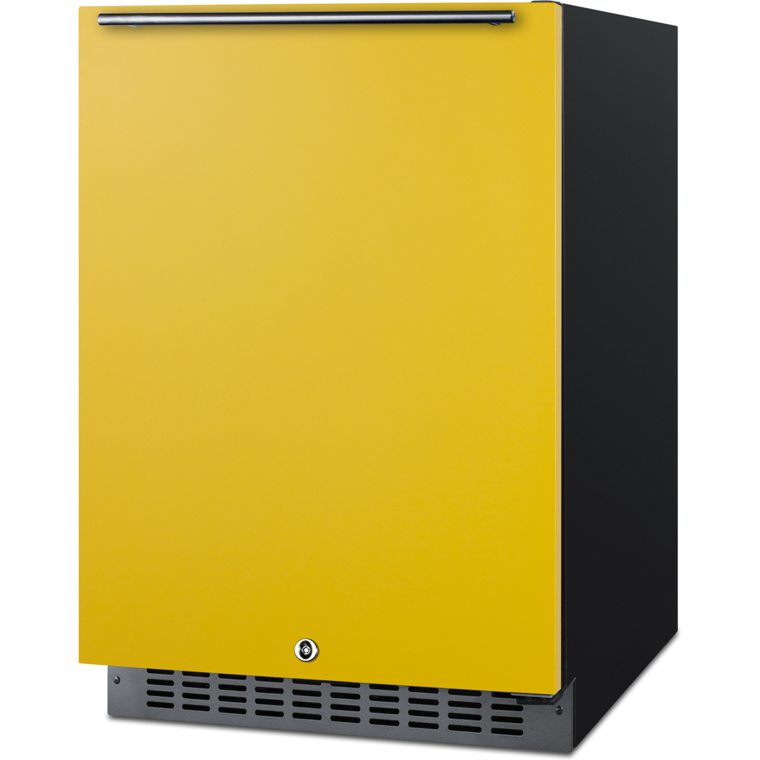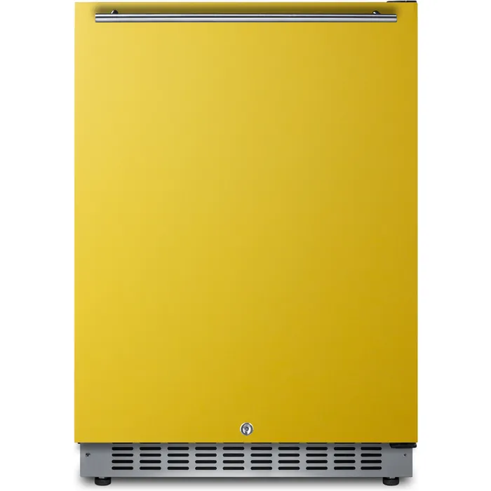 Model AL54Y is a 24" wide refrigerator sized at just 32" high for easy installation under lower ADA compliant counters. The front-breathing cooling system allows built-in use, while the fully finished black cabinet also enables freestanding applications. The door comes in a bright saffron gold hue, with a sleek horizontally mounted stainless steel handle and matching stainless steel kickplate to complete the unique look.