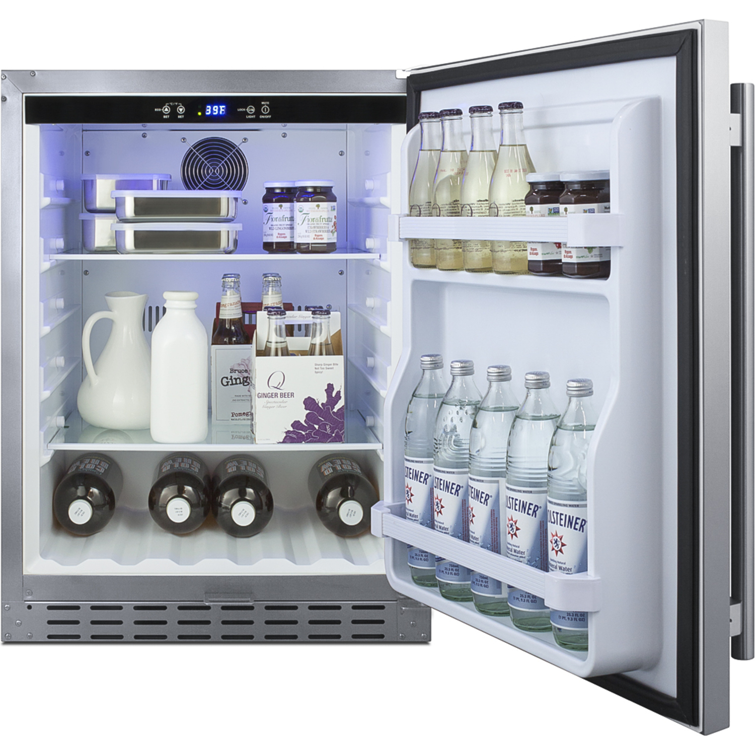 Inside, the AL55OSCSS has a digital control panel that allows you to manage the unit's temperature with ease. An adjustable temperature range between 36 and 46ºF ensures contents are kept cold. Three easy-glide glass shelves that extend 50% provide flexible storage, and the shelving brake system keeps unit contents safe when loading and unloading. Two-door racks are ideal for keeping condiments within easy reach, while the slotted floor ensures easy storage of bottles. The dimmable soft LED lighting in a gentle blue hue with three brightness settings offers an attractive and efficient presentation inside the white interior.