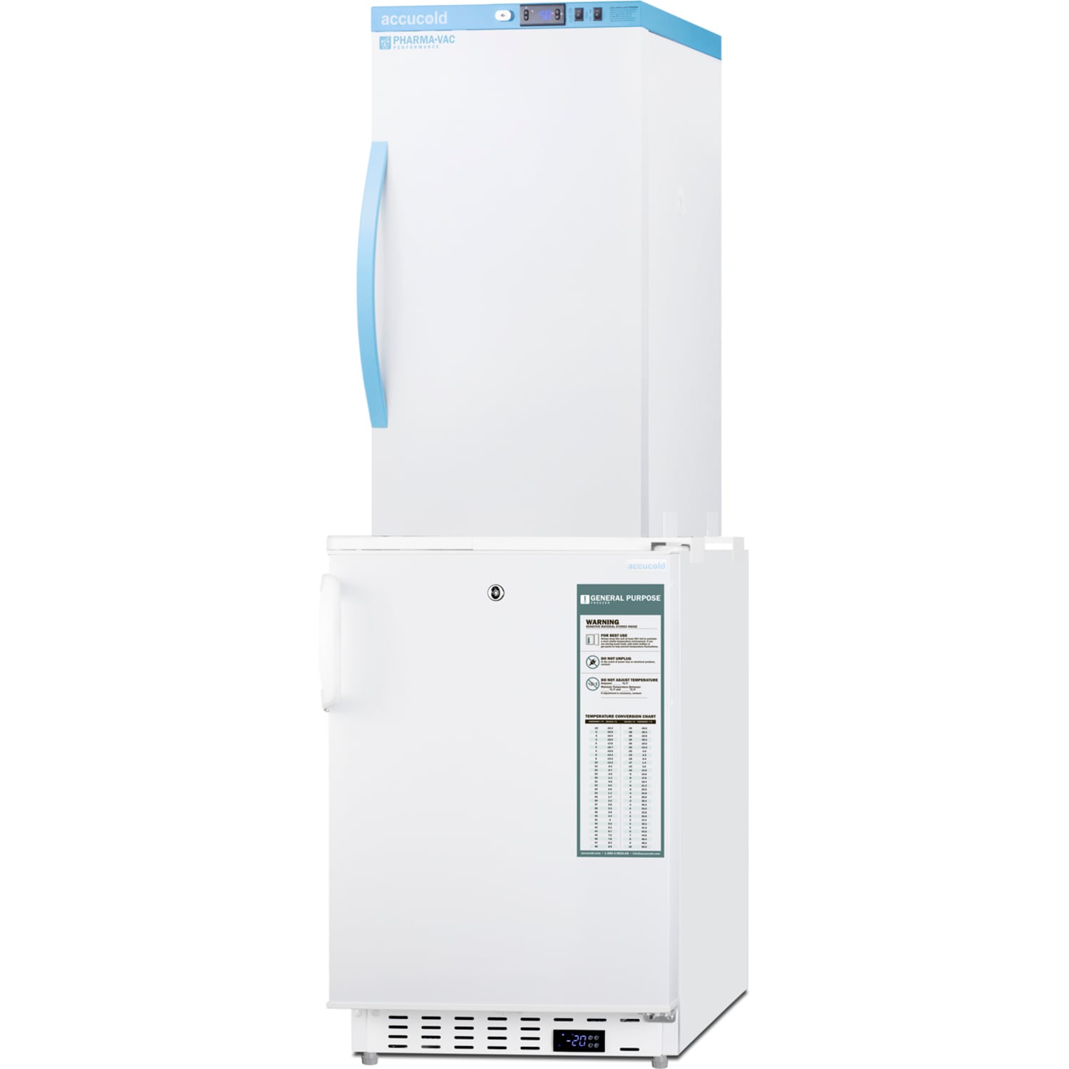 Both units include front-mounted keyed locks, powerful magnetic gaskets to ensure a positive seal, and hospital grade cords with 'green dot' plugs for added safety in high traffic areas. The refrigerator has a self-closing door. Additional stacked combinations are available. Browse Accucold's website for more information, or contact our sales team at 718-893-3900 to discuss your equipment needs.