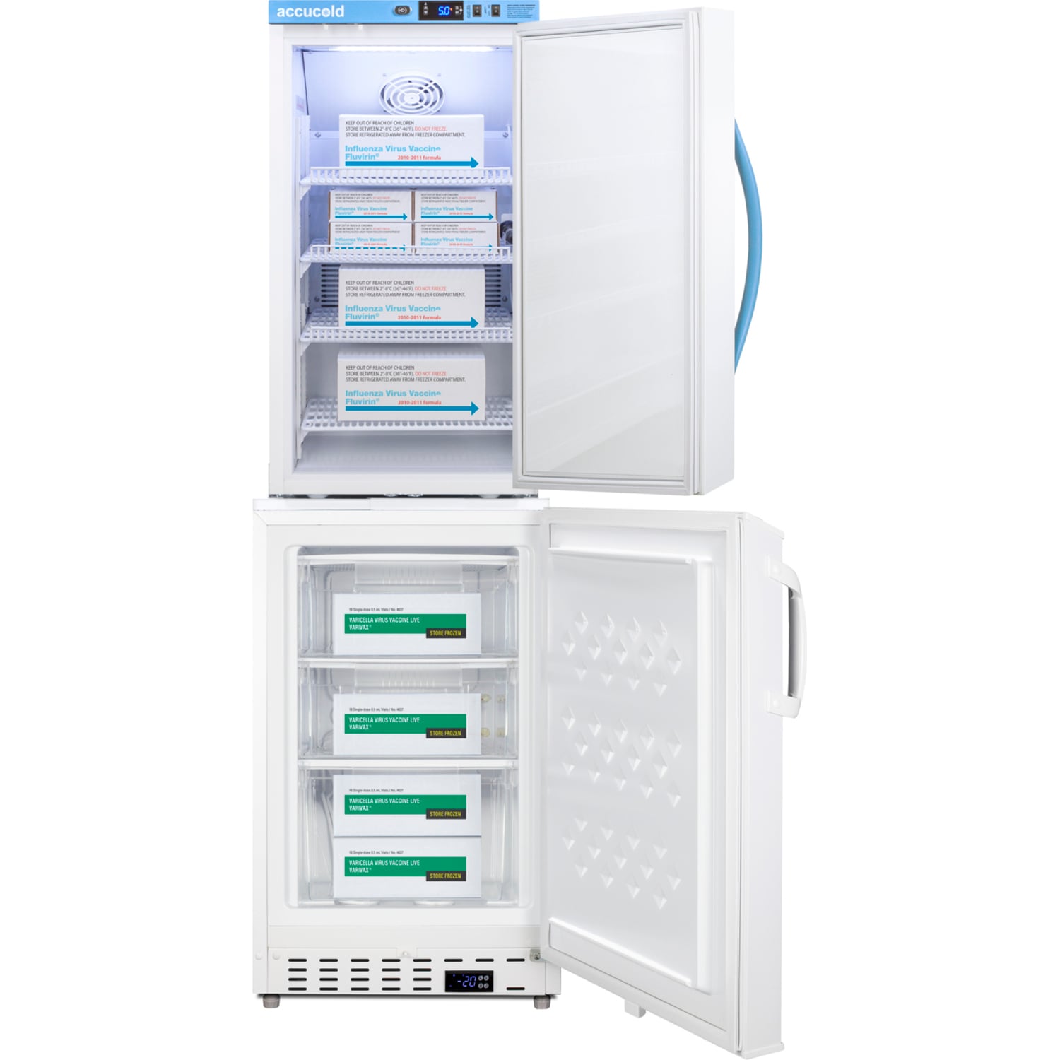- Stacked combination of ARS3PV automatic defrost vaccine refrigerator and ADA305AF manual defrost vaccine freezer, both with hospital grade cords with 'green dot' plugs
