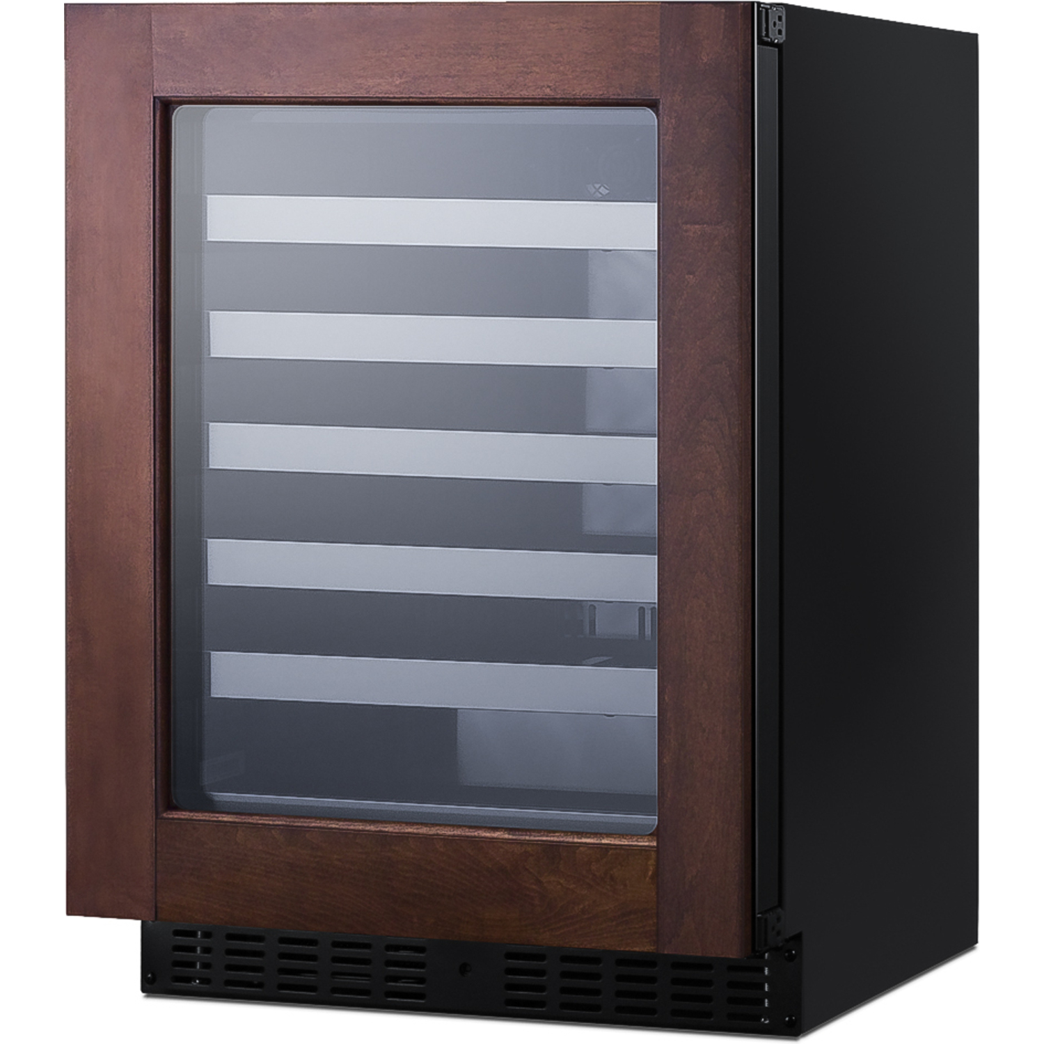 Model ASDW2412PNRLHD is a 24" wide 33-bottle single zone wine cellar sized under 18" deep. It comes in a 32" height to fit under lower ADA compliant counters, with adjustable legs and a sliding kickplate cover that also allows you to raise the overall height up to 34" to fit standard counter spaces. The front-breathing system allows built-in installation, while the fully finished black cabinet also allows freestanding use. This unit features our European style fully articulating hinge, allowing for easy installation of custom door trim panels to match your cabinetry. The sealed rear and right angle cord ensure a better fit. The door comes with a left hand swing and includes a front lock to protect your collection.