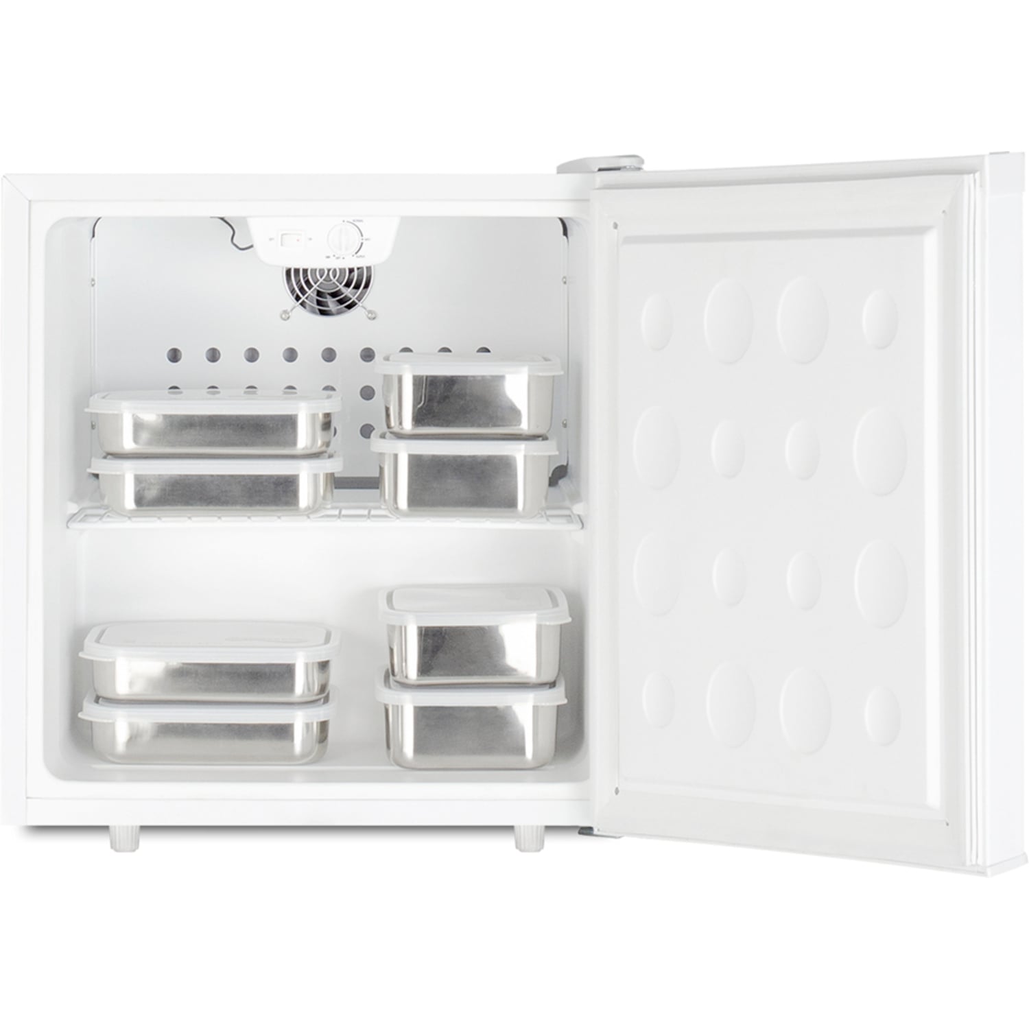 Inside, the AZAR2W utilizes automatic defrost operation for minimum user maintenance. An internal fan helps to keep a more even temperature throughout the 1.7 cu.ft. interior. A removable shelf is included to accommodate different sized storage needs. The dial thermostat is located inside, helping to prevent any accidental adjustments. This unit includes an interior LED light with an on/off rocker switch.