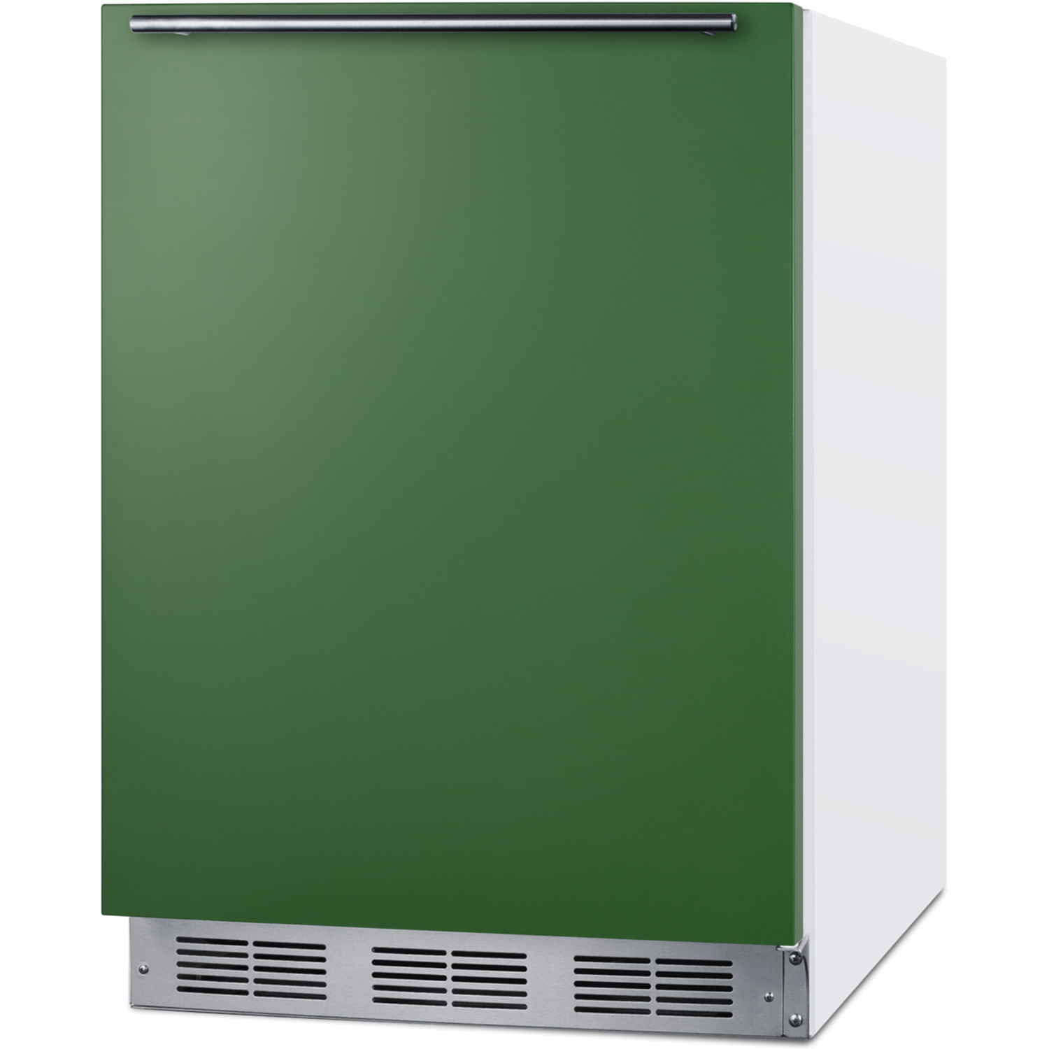 Model BAR611WHG is a 24" wide all-refrigerator with a generous 5.5 cu.ft. capacity. The door finish comes in a striking emerald green, with a sleek horizontally mounted stainless steel handle and matching stainless steel kickplate to complete the unique look. This unit has a white exterior cabinet. It is manufactured in Europe and modified in the United States with domestic steel finishing.
