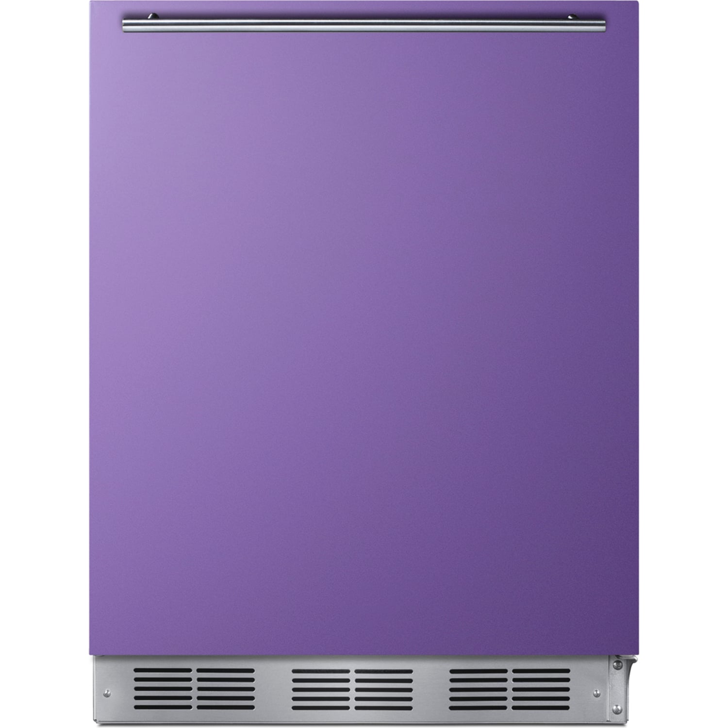 Model BAR611WHP is a 24" wide all-refrigerator with a generous 5.5 cu.ft. capacity. The door finish comes in an attractive lavender purple hue, with a sleek horizontally mounted stainless steel handle and matching stainless steel kickplate to complete the unique look. This unit has a white exterior cabinet. It is manufactured in Europe and modified in the United States with domestic steel finishing.