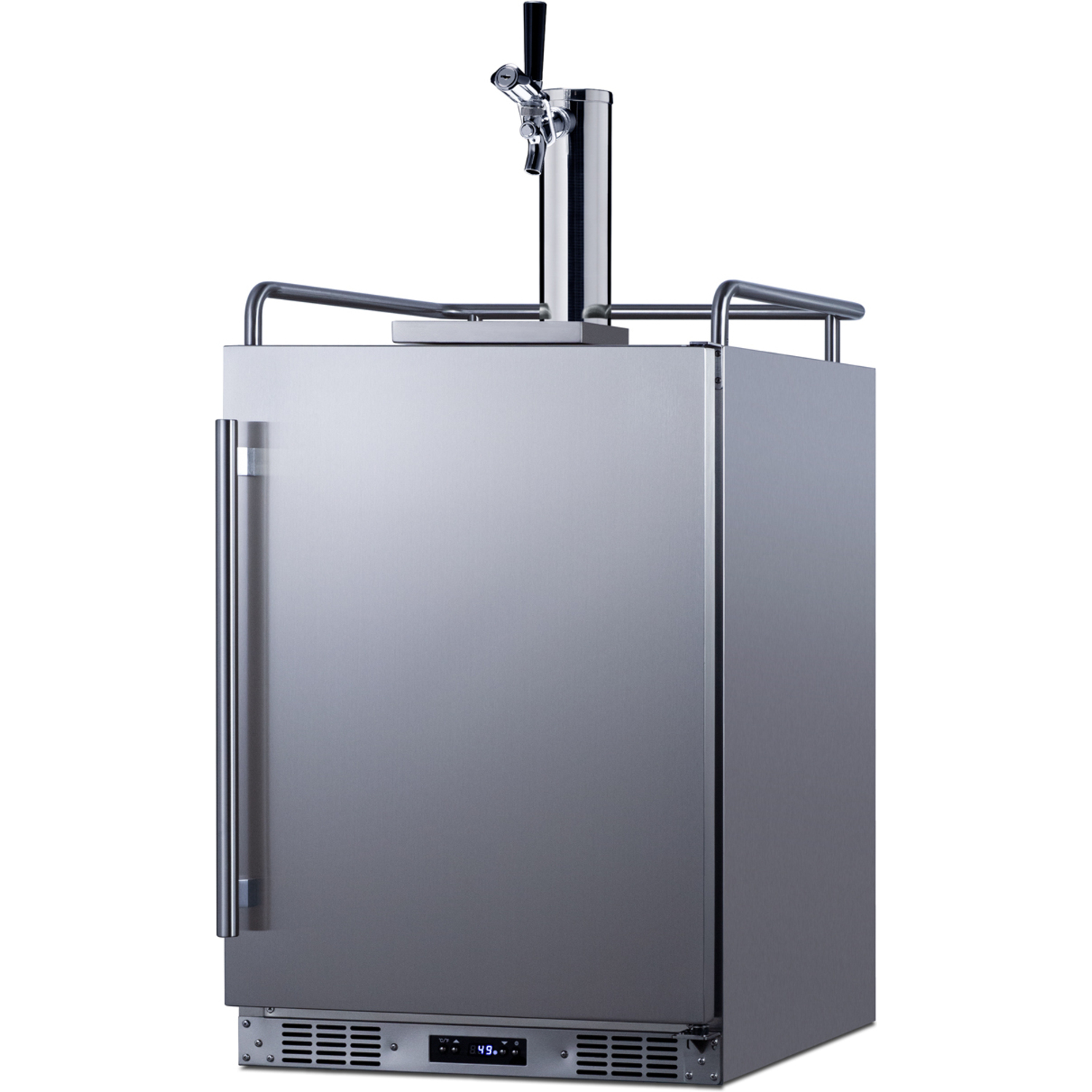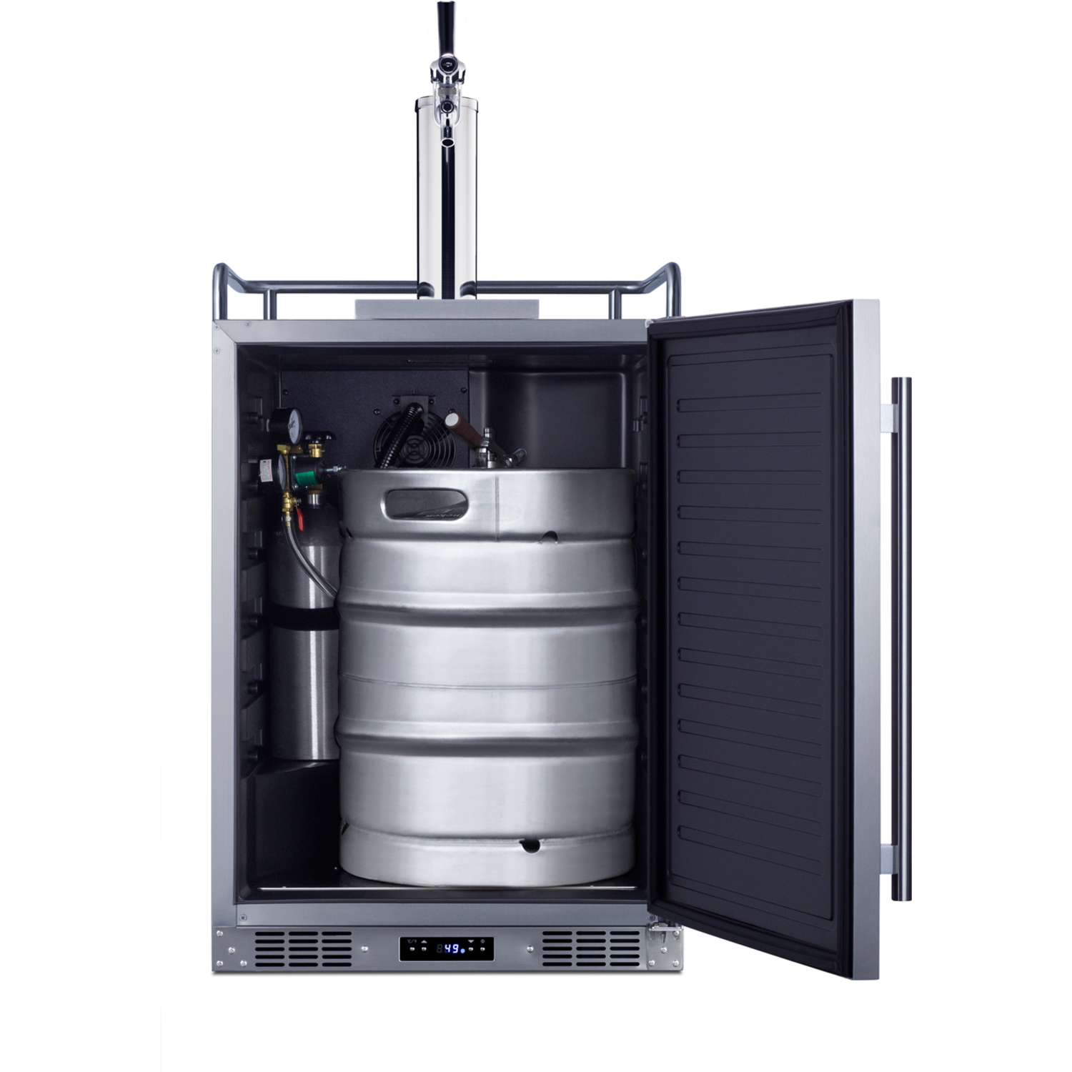 Inside, the 5.6 cu.ft. interior can accommodate a full half or slim quarter keg, or up to three Cornelius or sixth barrel kegs. We include a complete commercial grade tap kit for dispensing your favorite beer, including a Sankey tap system and single tap draft tower, along with a CO2 tank and regulator. A tap cool system keeps your beer cold as it goes through your tower, and a Velcro strap holds the CO2 tank in place. The interior floor is made from stainless steel to add protection when loading and removing kegs. Two chrome shelves, with six placement options, allow the kegerator to also function as a beverage refrigerator. A digital thermostat makes it easy to manage the wide range temperature, while the external digital display has a readout in Celsius or Fahrenheit. Automatic defrost operation ensures minimal user maintenance. The Memory IC function recovers the unit's last settings in the case of a power outage or disruption.