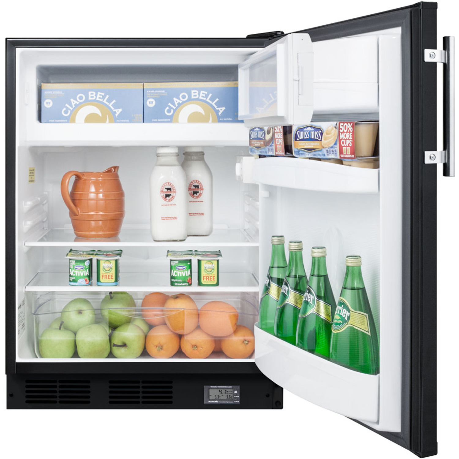 The BKRF663B is a counter height refrigerator-freezer made in Europe and sized with a 24" footprint. It features a black exterior finish and stainless steel handle, with a user-reversible door swing for added flexibility. A factory-installed NIST calibrated thermometer is located in the kickplate to provide a continuous display of the current and high/low temperatures of the refrigerator compartment to the nearest tenth of a degree. Temperature can be viewed in Celsius or Fahrenheit for added convenience. The device also includes an audible alarm to warn of major temperature fluctuations.