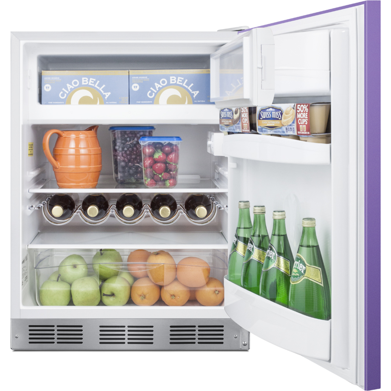 Bottles: 0Defrost Type: CycleDoor: PurpleCabinet: WhiteUS Electrical Safety: ETLCanadian Electrical Safety: ETL-CSanitation: N/AVoltage/Frequency: 115 V AC/60 HzParts & Labor Warranty: 1 YearCompressor Warranty: 5 Years