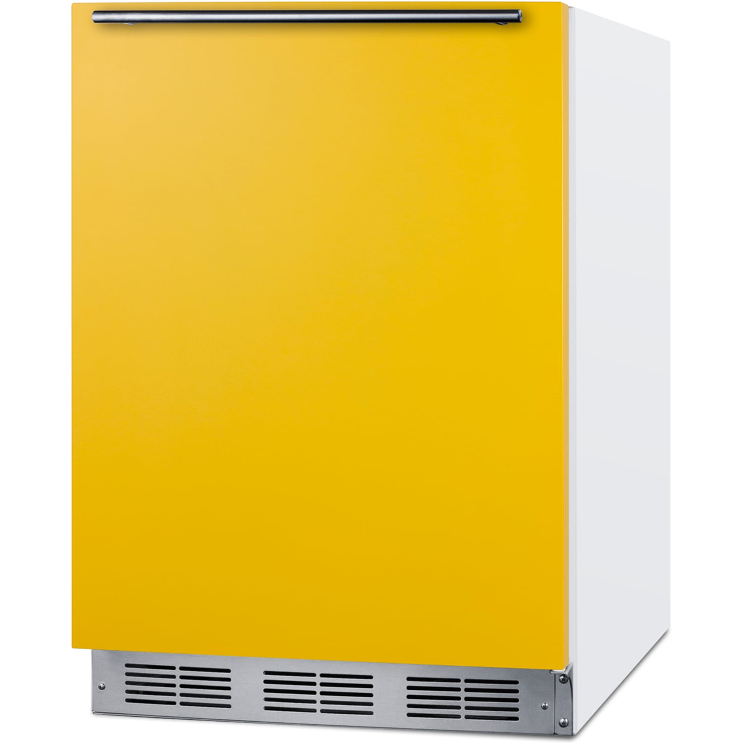 Model BRF611WHY is a 24" wide refrigerator-freezer with a generous capacity of more than 5 cu.ft. to meet general storage needs. The door comes in a bright saffron gold hue, with a sleek horizontally mounted stainless steel handle and matching stainless steel kickplate to complete the unique look. This unit has a white exterior cabinet. It is manufactured in Europe and modified in the United States with domestic steel finishing.