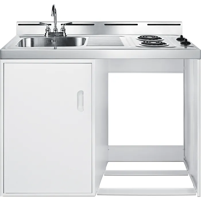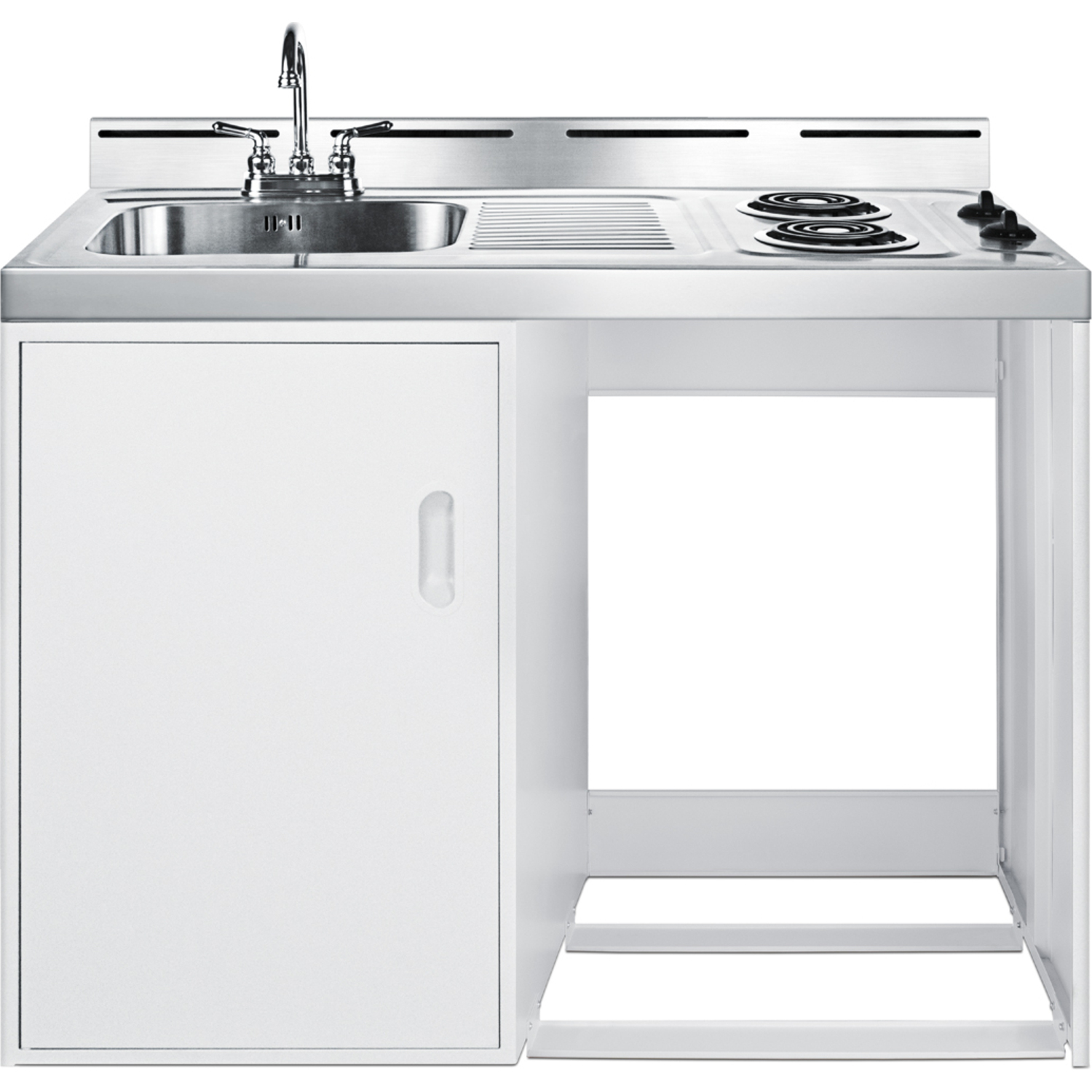 The C48ELNR is a 48" wide kitchenette. It includes a built-in 115V 2-element cooktop with coil burners and a pre-installed cord with a standard NEMA 5-15 plug for easy setup. The stainless steel sink includes a faucet for hot and cold water. Two cabinets provide ample space for dry storage. This unit ships with an opening that can accept a 33" H x 24" W x 24" deep appliance, including our popular line of refrigerators.