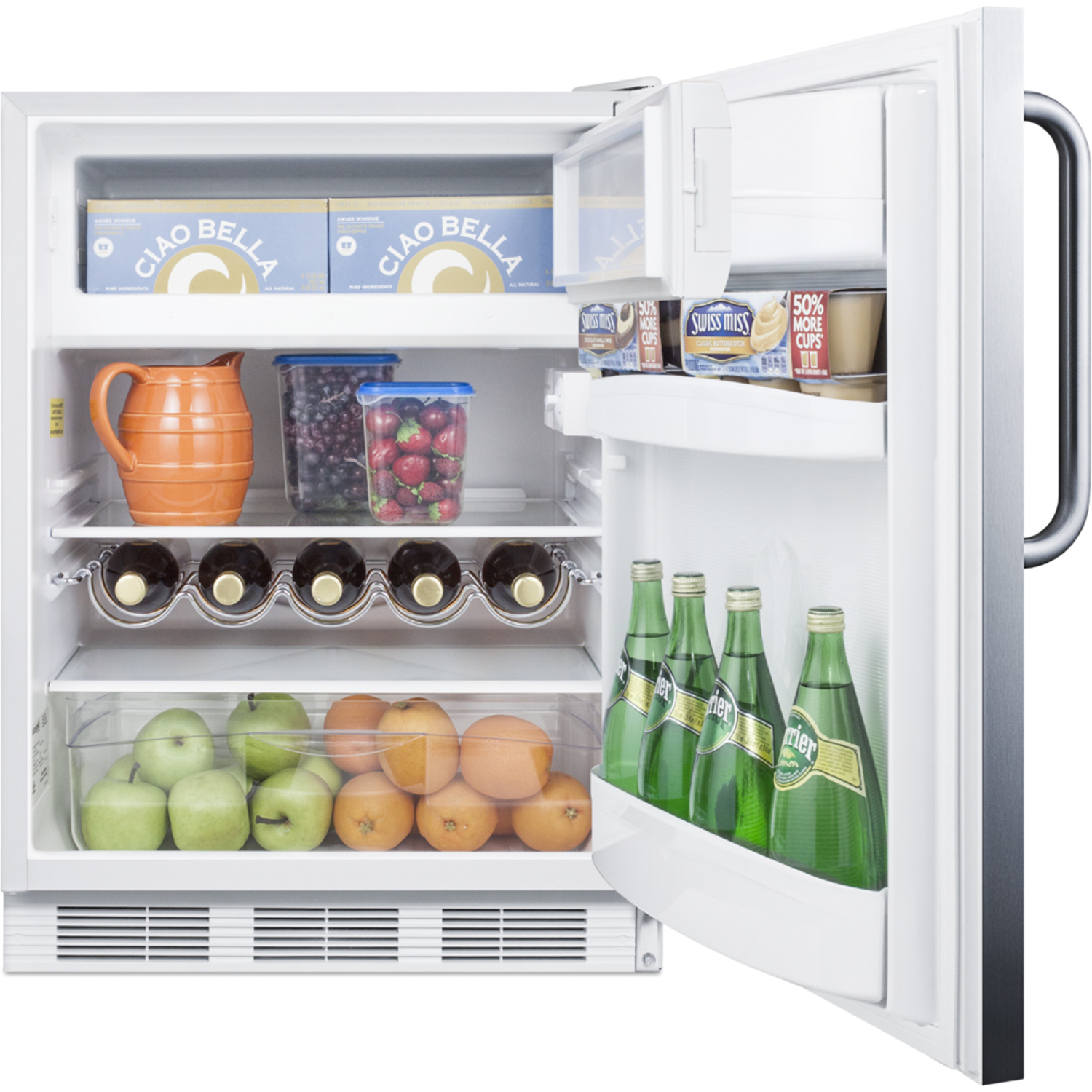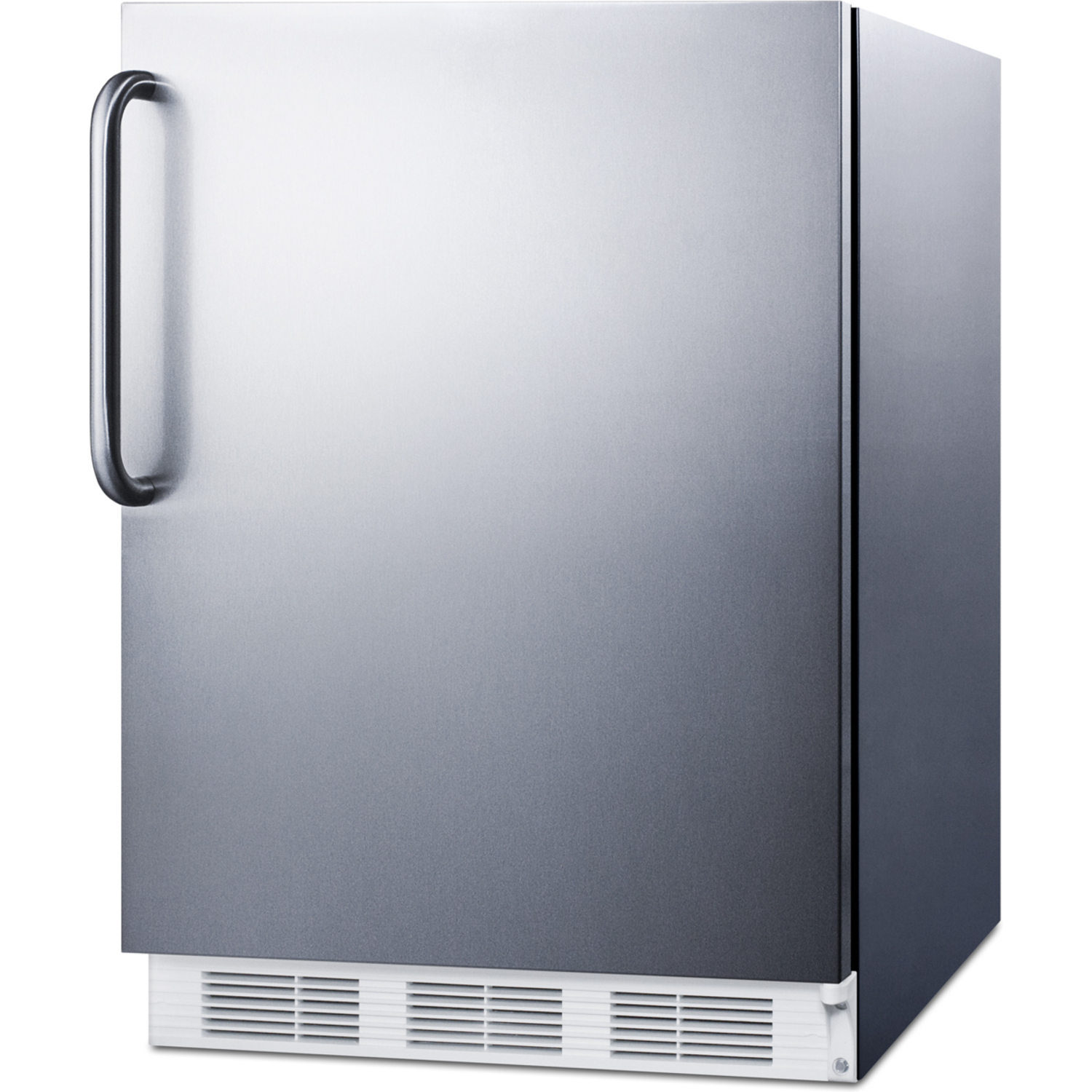 Sized with a 24” footprint, the CT661WCSSADA refrigerator-freezer offers a generous 5.1 cu.ft. storage capacity, larger than many units in this size class. The 32” height and front-breathing design makes it ideal for installation under lower counters complying with ADA guidelines for height restriction. The fully finished cabinet also enables freestanding use. This unit comes with a fully wrapped stainless steel door and cabinet. A curved towel bar handle in brushed stainless steel completes the professional look.