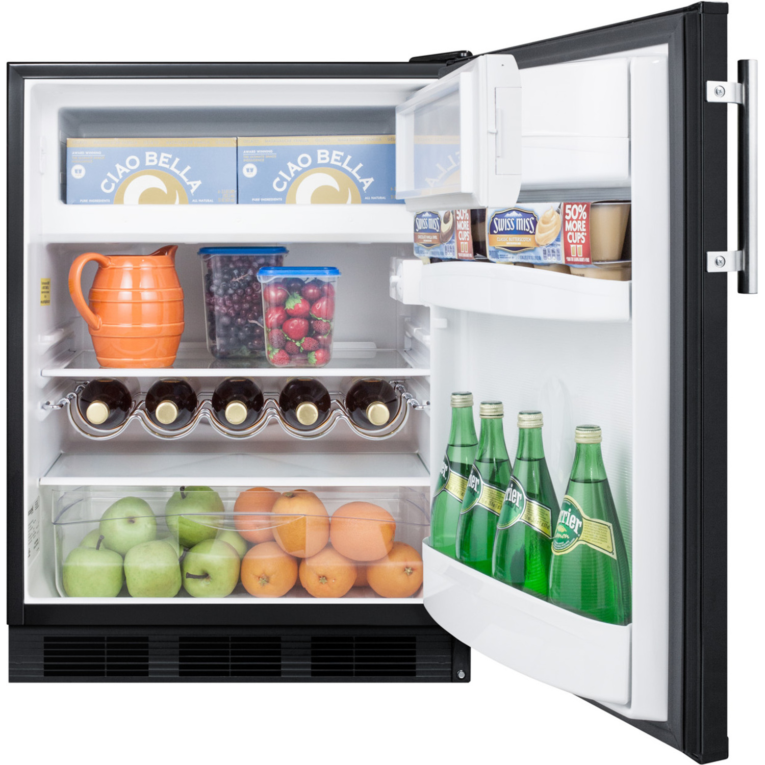 Sized with a 24” footprint, CT663BK refrigerator-freezer offers a generous 5.1 cu.ft. storage capacity, a larger interior than many units in this size class. This model features a black exterior finish with a user-reversible door swing. A stainless steel handle completes the look.