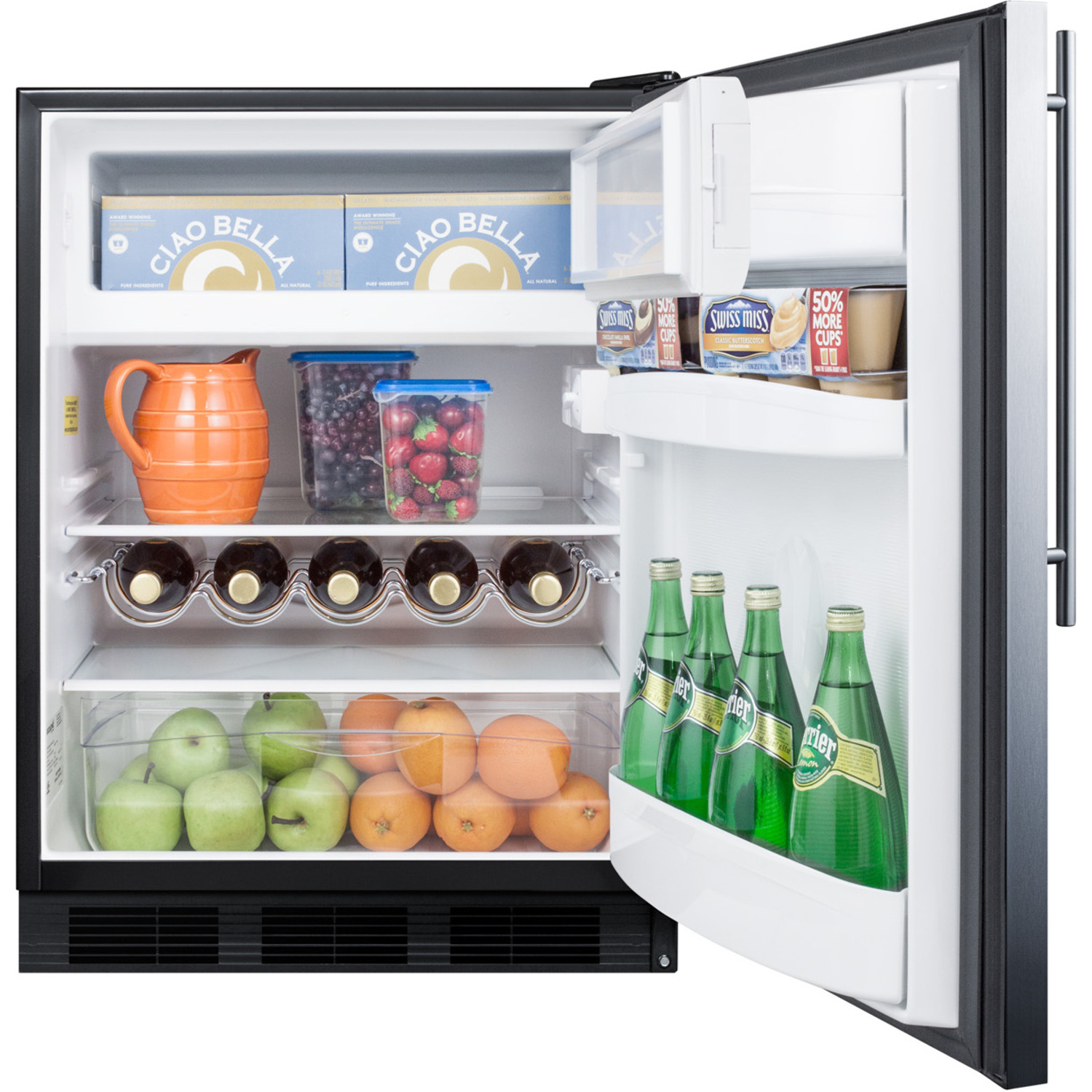 Bottles: 0Defrost Type: CycleDoor: Stainless SteelCabinet: BlackUS Electrical Safety: ULCanadian Electrical Safety: ULCSanitation: N/AVoltage/Frequency: 115 V AC/60 HzParts & Labor Warranty: 1 YearCompressor Warranty: 5 Years