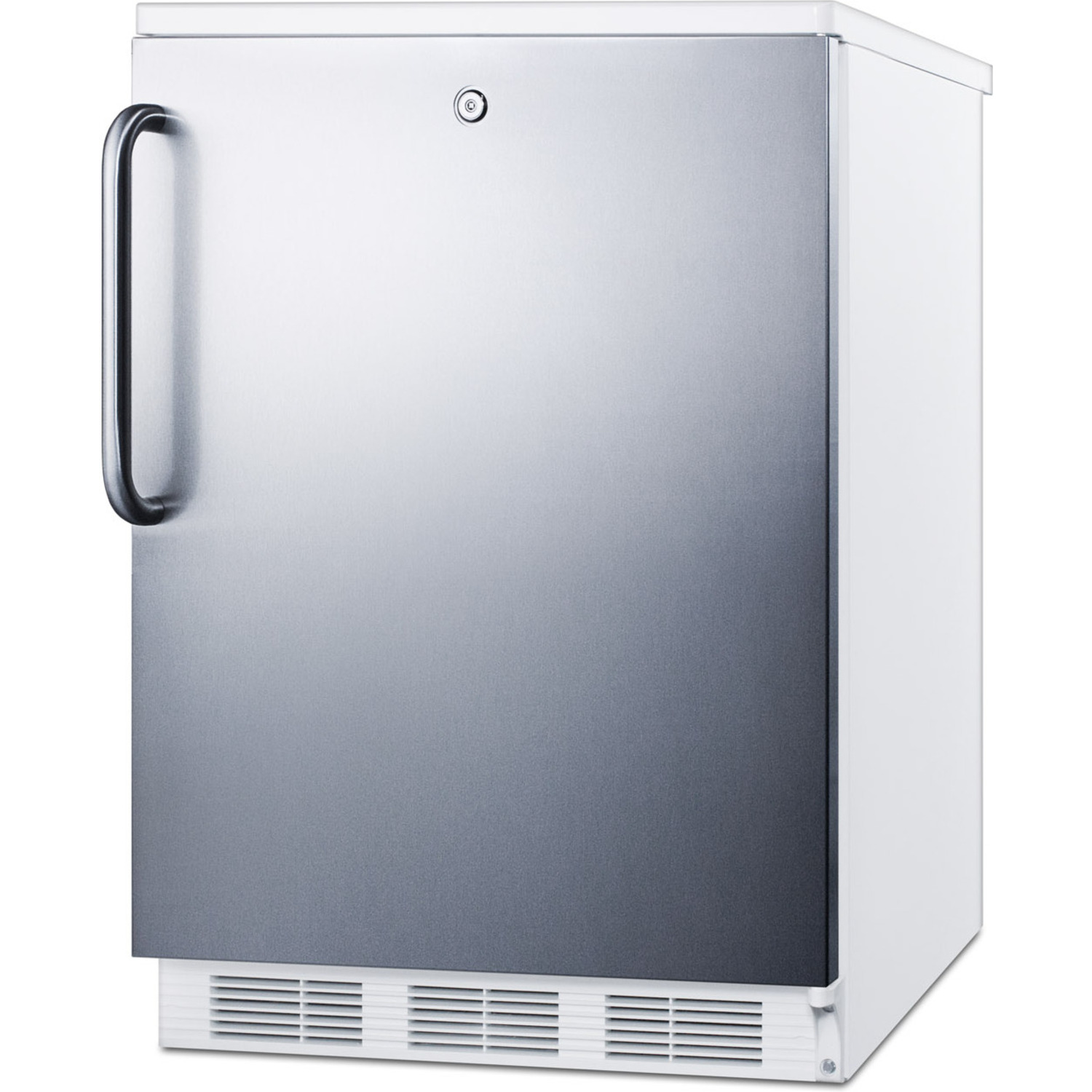 At 32" high, the CT66LWSSTBADA is designed for freestanding use in ADA compliant facilities. The 24" footprint offers overly 5 cu.ft. of storage capacity. This model features a white cabinet and a stainless steel wrapped door with a factory installed lock. A curved towel bar handle completes the look.