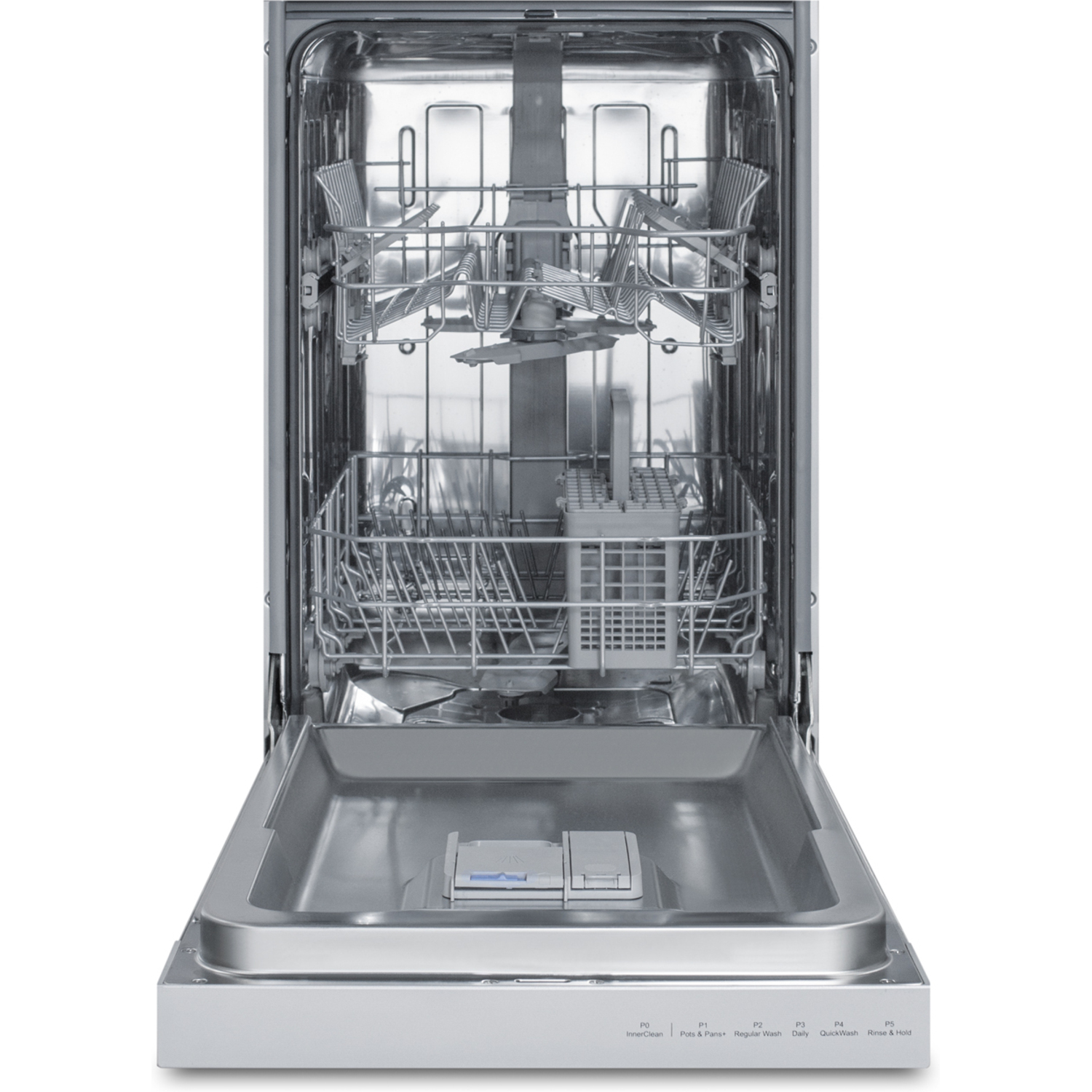 Inside, the DW18SS4 features a stainless steel interior for lasting durability. Quality insulation helps to ensure a quiet 49 db performance. This unit features two slide-out racks to wash up to 8 place settings. The upper rack is best suited for cups and other lighter items, with adjustable side tines that make it easier to accommodate tall glasses or to stack smaller mugs. The lower rack is ideal for plates, pots, and other heavier soiled items. A removable cutlery basket with six sections makes it easy to keep your utensils together for quicker storage after a wash.