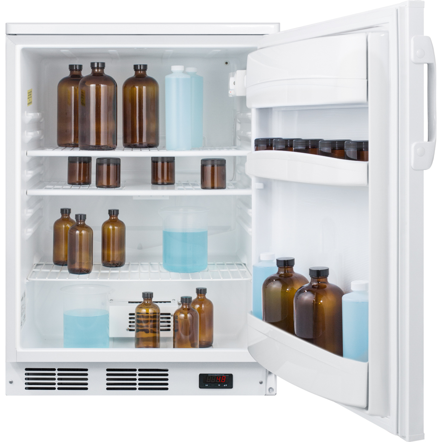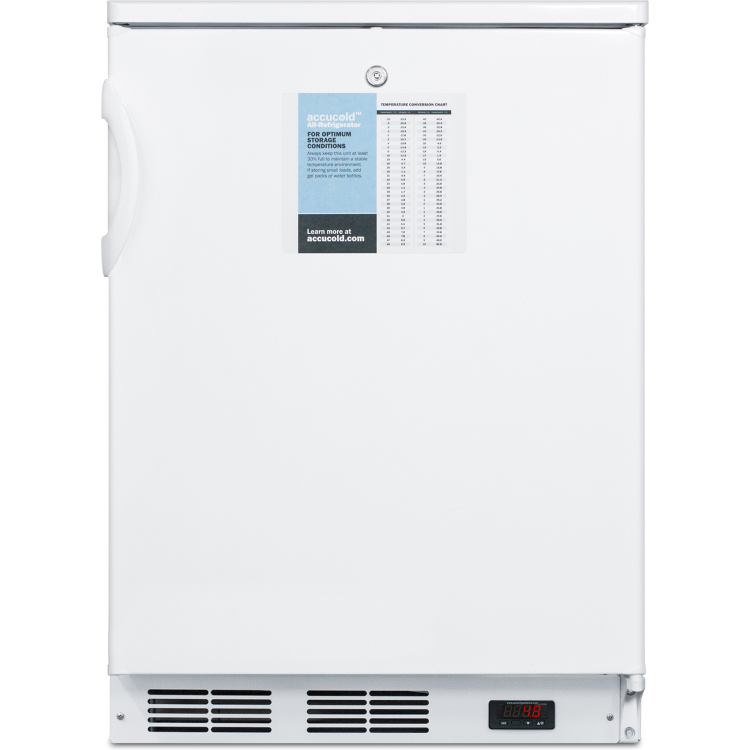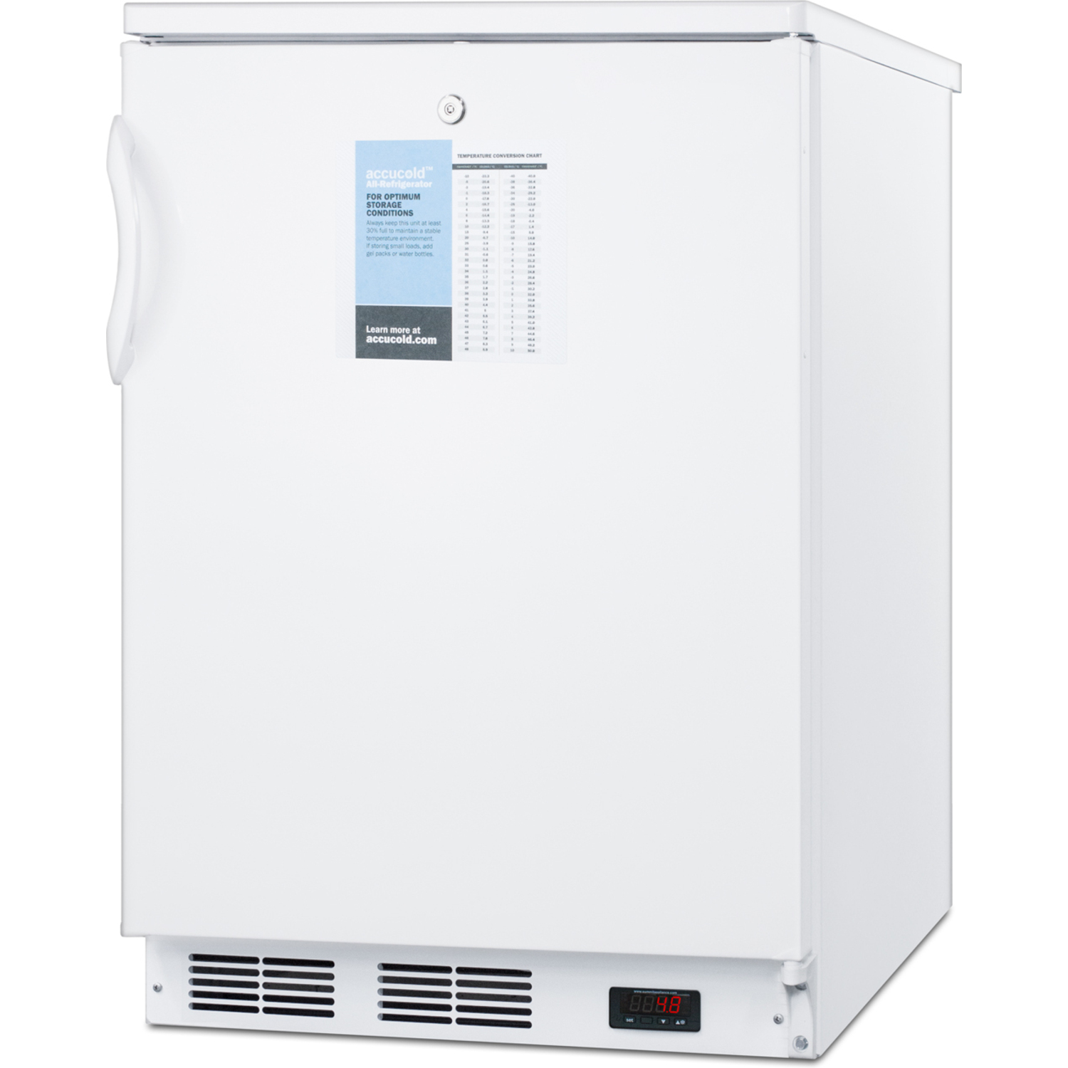 Sized just under 24" wide, the FF6LWPRO is an all-refrigerator designed for freestanding use in hospitals, doctors' offices, and other facilities with specific temperature needs. Made in Europe, it comes in a white finish with a fully finished cabinet and user-reversible door swing. A hospital grade cord with a 'green dot' plug offers added safety in high traffic areas and factory-installed lock is located towards the top of the unit for convenient security. This unit includes a digital thermostat for optimum temperature precision located in the kickplate.