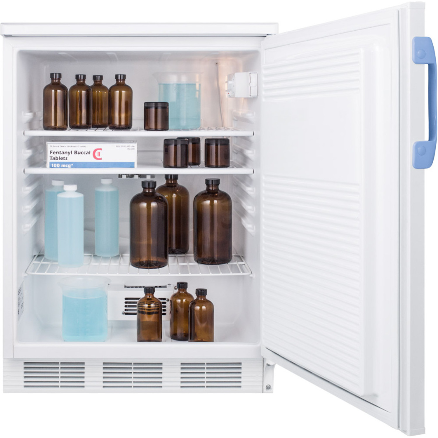 As recommended by the CDC, VFC and VFA programs, the FF7LWBIMED2 is equipped with a NIST calibrated thermometer that displays the current, minimum, and maximum temperatures to the nearest tenth of a degree with a readout viewable in Celsius or Fahrenheit. Each FF7LBIMED2 ships with a certificate of calibration for your records. The thermometer includes an audible alarm to warn users if the interior has gone out of the programmed temperature range. The buffered temperature probe is encased in a glycol-filled bottle and secured inside the center shelf to best simulate the temperature of other stored contents, resulting in the utmost accuracy for temperature reporting. We include a pre-installed 3/8" probe hole for users who wish to install additional monitoring equipment.