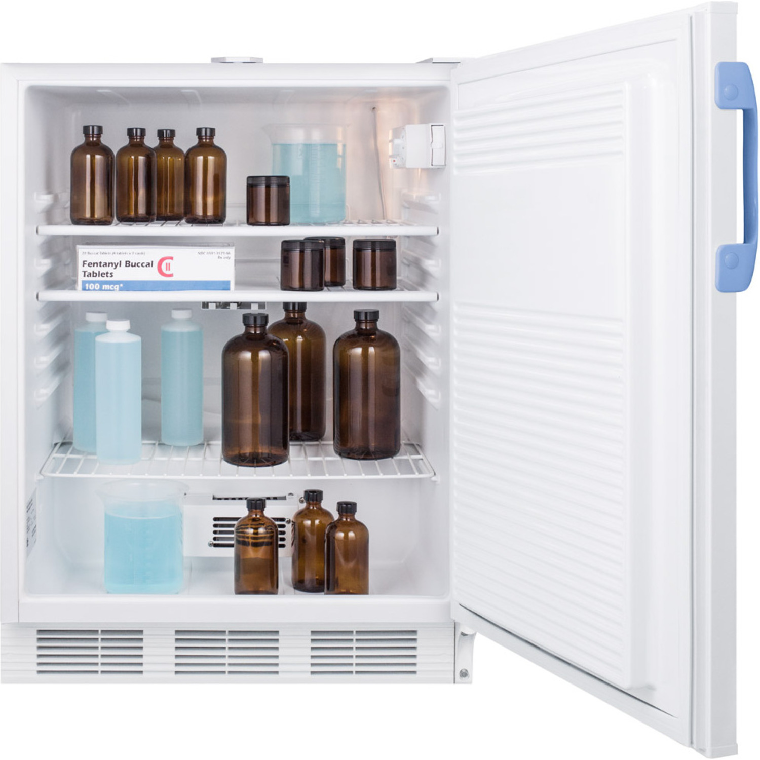 As recommended by the CDC, VFC and VFA programs, the FF7LWBIMED2ADA is equipped with a NIST calibrated thermometer that displays the current, minimum, and maximum temperatures to the nearest tenth of a degree with a readout viewable in Celsius or Fahrenheit. Each FF7LWBIMED2ADA ships with a certificate of calibration for your records. The thermometer includes an audible alarm to warn users if the interior has gone out of the programmed temperature range. The buffered temperature probe is encased in a glycol-filled bottle and secured inside the center shelf to best simulate the temperature of other stored contents, resulting in the utmost accuracy for temperature reporting. We include a pre-installed 3/8" probe hole for users who wish to install additional monitoring equipment.