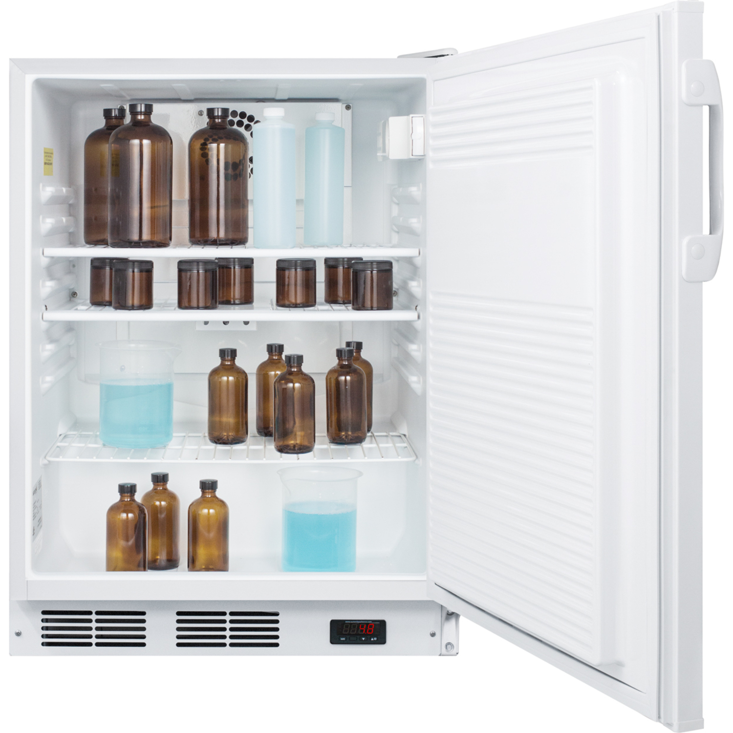 The unit uses automatic defrost operation and includes an internal fan for stabilized cooling. Adjustable wire shelves offer flexible storage inside the 5.5 cu.ft. interior, with a flat door liners as recommended by the CDC. The FF7LWBIPLUS2ADA includes a thermometer calibrated to NIST standards in our ISO/IEC 17025:2017 laboratory. It displays the current, minimum, and maximum temperature to the nearest tenth degree viewable in Celsius or Fahrenheit. The buffered temperature probe is stored in a glycol-filled bottle to ensure the temperature reading best reflects the temperature of other stored refrigerator contents.