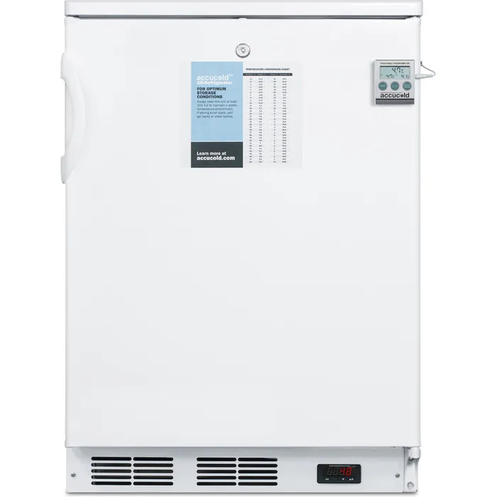 The unit uses automatic defrost operation and includes an internal fan for stabilized cooling. Adjustable wire shelves offer flexible storage inside the 5.5 cu.ft. interior, with a flat door liners as recommended by the CDC. The FF7LWPLUS2 includes a thermometer calibrated to NIST standards in our ISO/IEC 17025:2017 laboratory. It displays the current, minimum, and maximum temperature to the nearest tenth degree viewable in Celsius or Fahrenheit. The buffered temperature probe is stored in a glycol-filled bottle to ensure the temperature reading best reflects the temperature of other stored refrigerator contents.