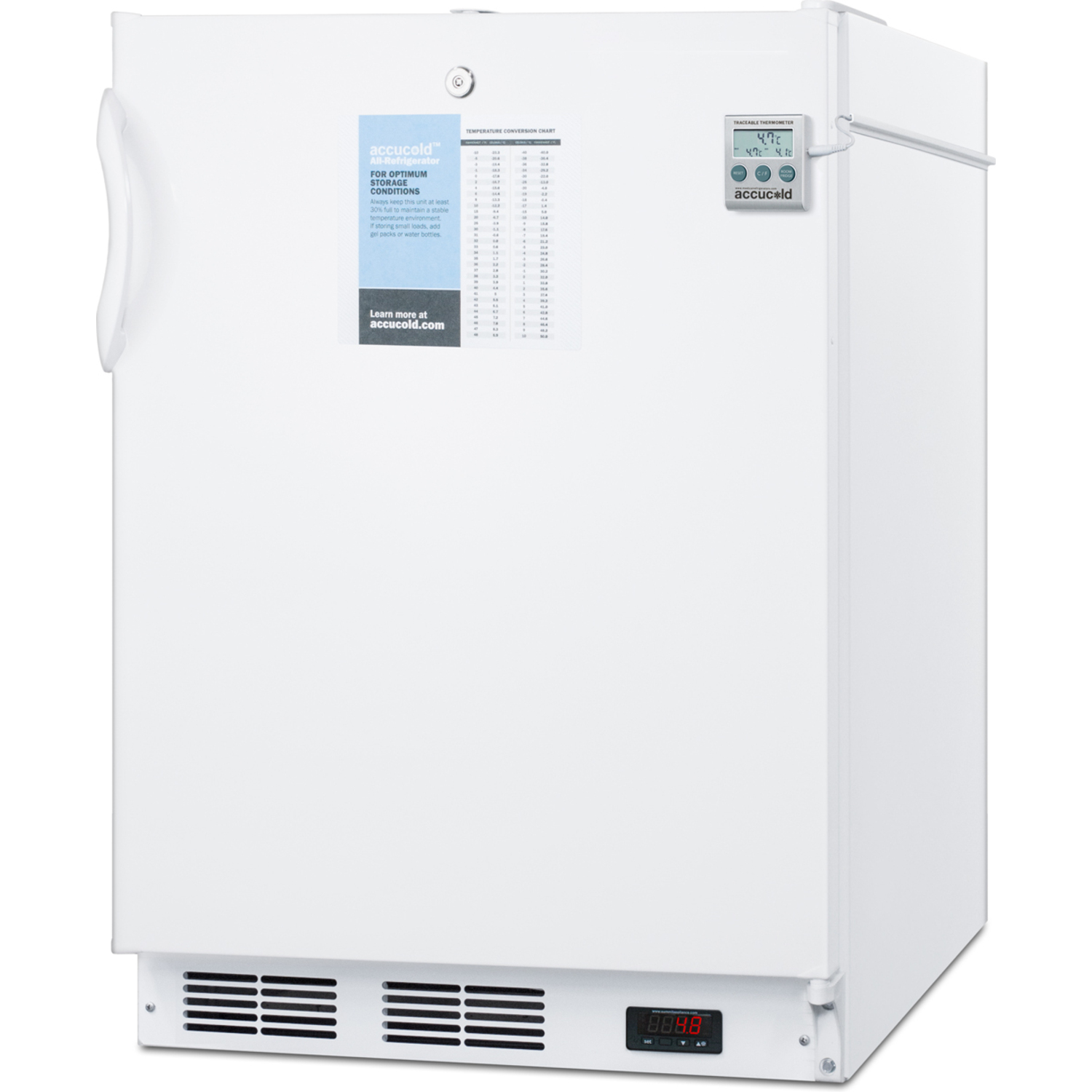 The unit uses automatic defrost operation and includes an internal fan for stabilized cooling. Adjustable wire shelves offer flexible storage inside the 5.5 cu.ft. interior, with a flat door liners as recommended by the CDC. The FF7LWPLUS2ADA includes a thermometer calibrated to NIST standards in our ISO/IEC 17025:2017 laboratory. It displays the current, minimum, and maximum temperature to the nearest tenth degree viewable in Celsius or Fahrenheit. The buffered temperature probe is stored in a glycol-filled bottle to ensure the temperature reading best reflects the temperature of other stored refrigerator contents.