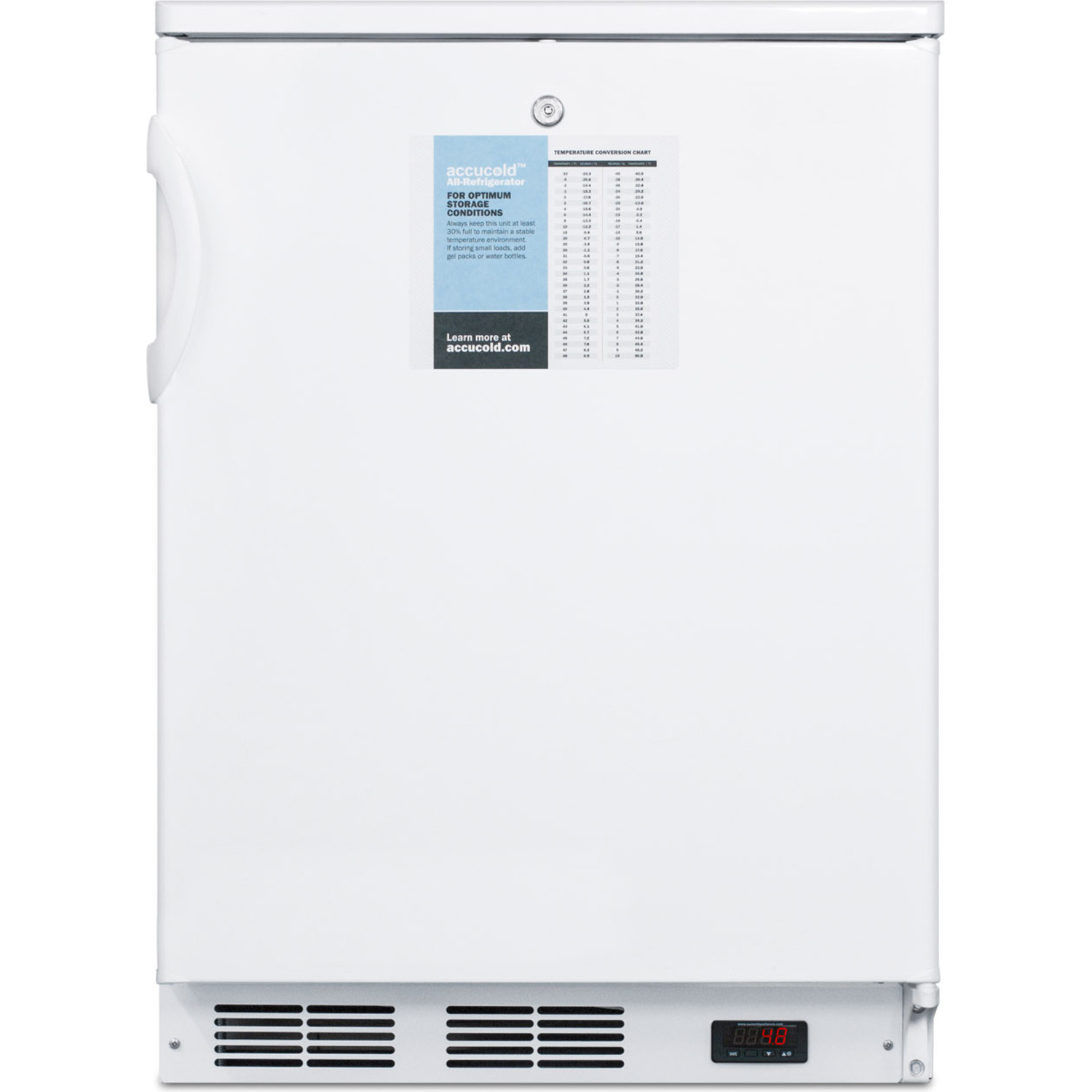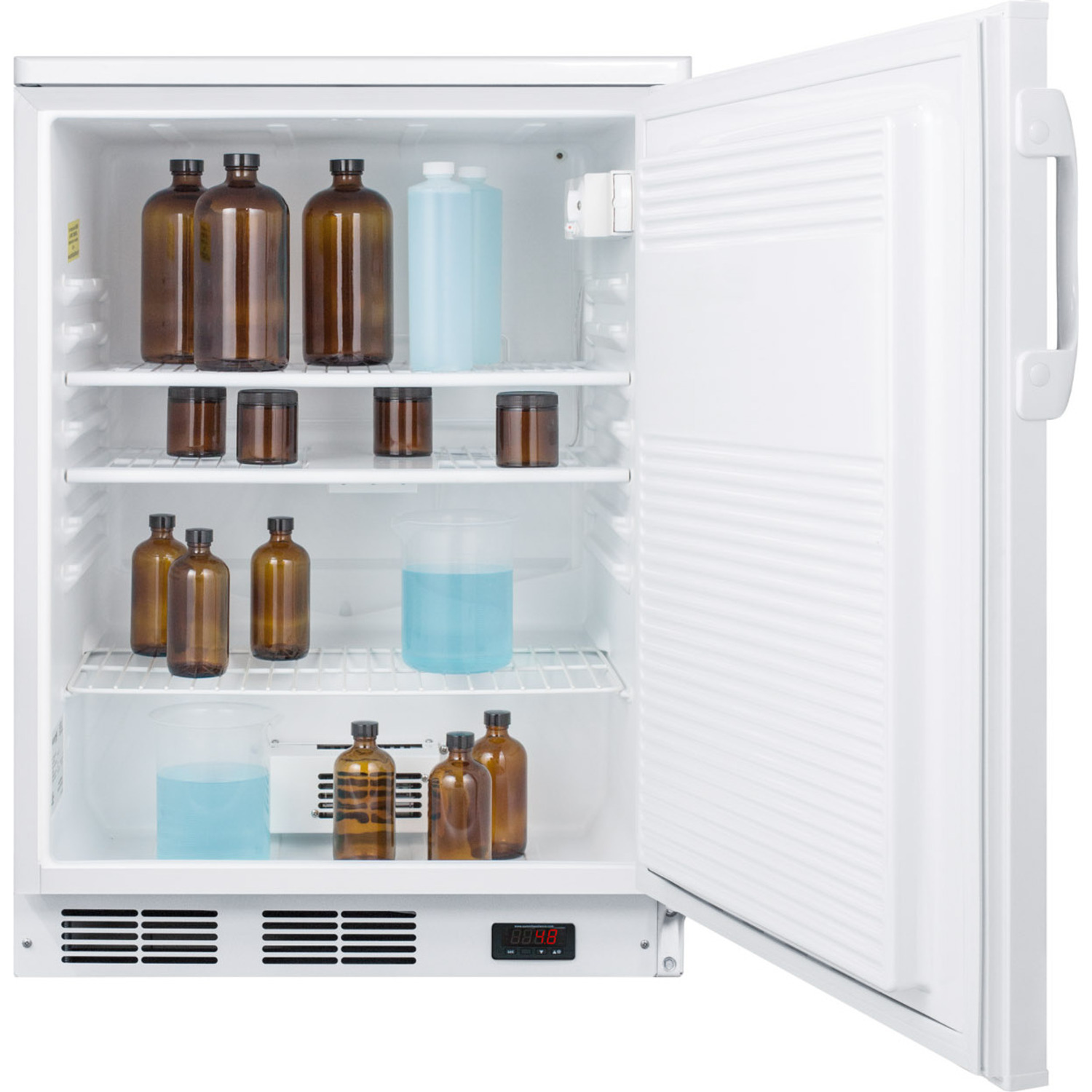 Sized at just under 24" wide, the FF7LWPRO is an all-refrigerator designed for freestanding use hospitals, doctors' offices, and other facilities with specific temperature needs. Made in Europe, it comes in a white finish with a fully finished cabinet and user-reversible door swing. A hospital grade cord with a 'green dot' plug offers added safety in high traffic areas and factory-installed lock is located towards the top of the unit for convenient security. This unit includes a digital thermostat for optimum temperature precision located in the kickplate.