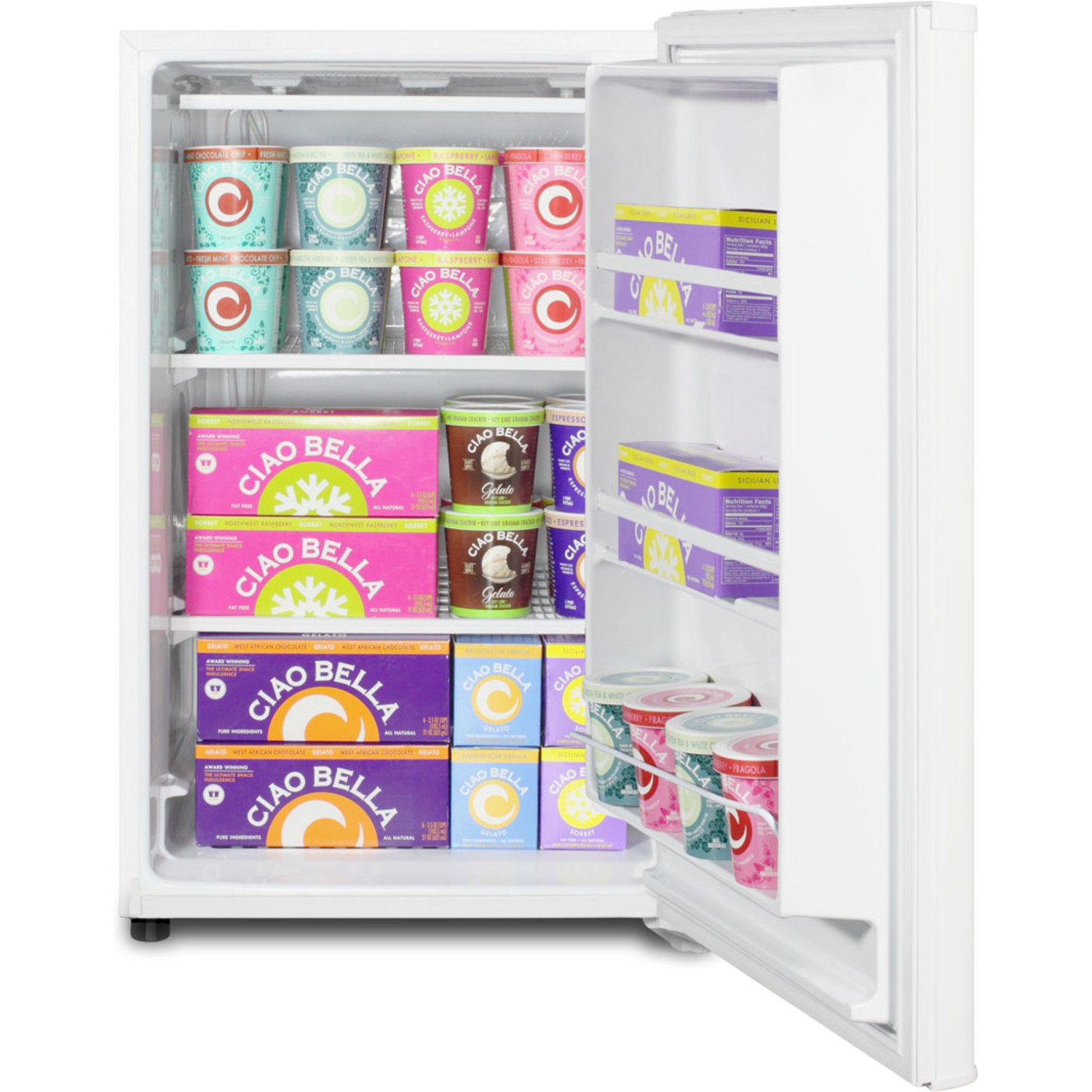 Model FS605 is a freestanding residential upright freezer with a full 5 cu.ft. interior capacity. Two fixed wire shelves feature built-in cooling coils to ensure stored items are stored under the right temperature conditions. Three door racks offer additional storage convenience. This unit utilizes a static manual defrost system and unobtrusive technology with our simple and intuitive dial temperature controls.