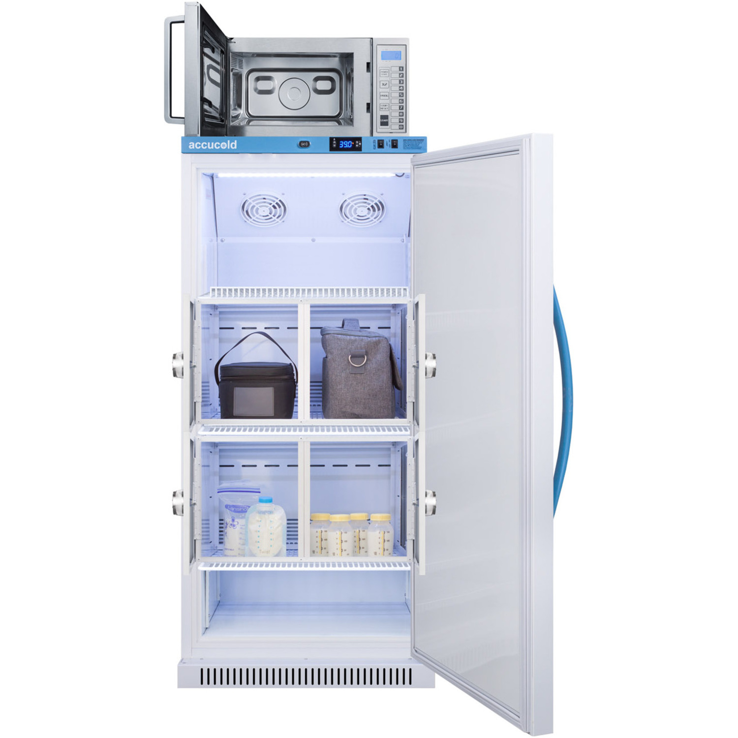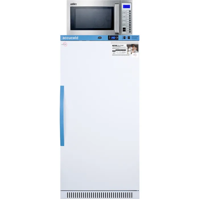 The MLRS8MCLK-SCM1000SS combines Accucold’s MOMCUBE 8 cu.ft. all-refrigerator for breast milk storage with Summit’s stainless steel commercial microwave. The complete unit has a slim width under 24"es providing for an easy fit in a variety of spaces. The refrigerator's reversible door allows for additional flexibility in unit placement.