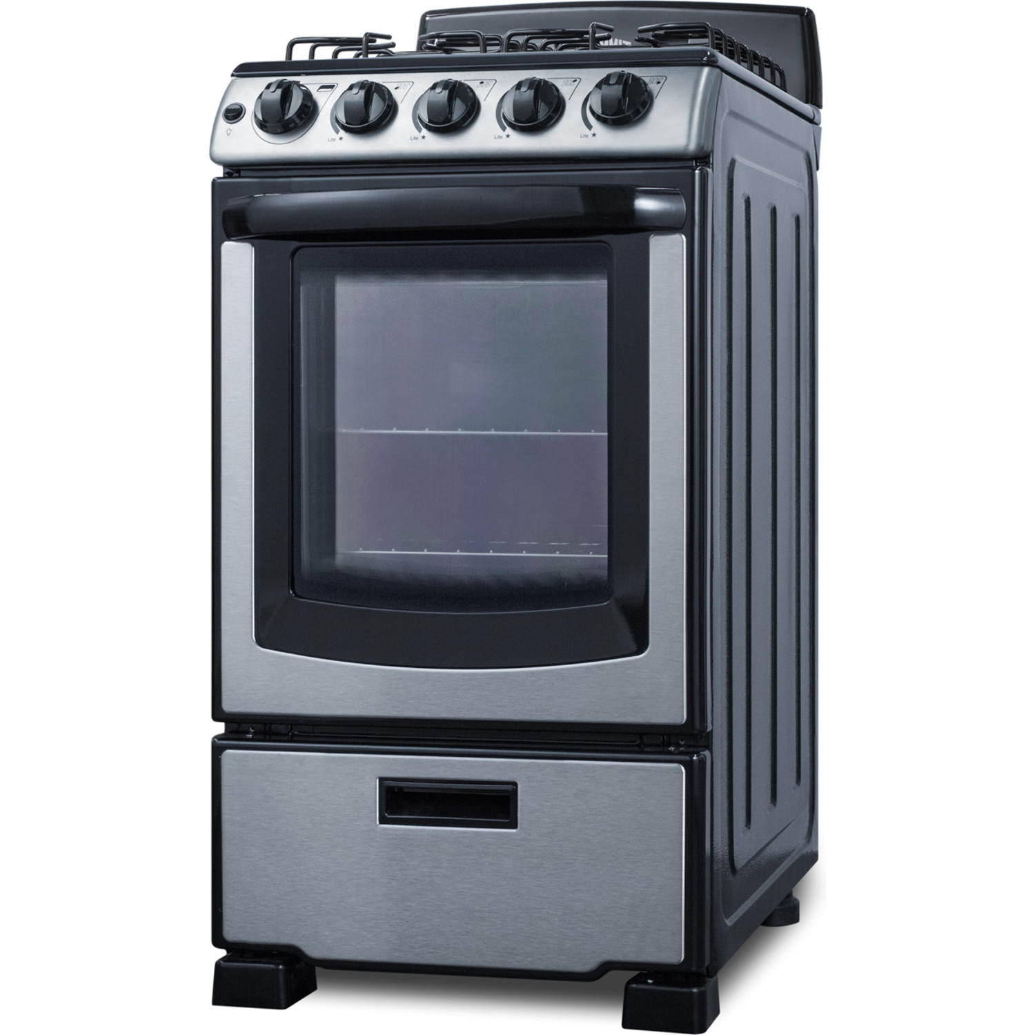 The PRO201SS is sized at just 20" wide for an easy fit in smaller kitchen spaces. It comes in a stainless steel and black finish for a professional look to match a variety of styles. The stainless steel oven door includes a large window and easy-grip handle for cooking convenience.This model utilizes electronic spark ignition and features four sealed burners for safer, cleaner cooking. One 12,000 BTU burner offers faster cooking for larger vessels, with two standard 9,500 BTU burners and a smaller 5,000 BTU burner for lower heating needs. The high backguard helps to protect your walls from spills, with enamel grates for lasting durability. The control panel includes upfront push-to-turn burner knobs for added safety.