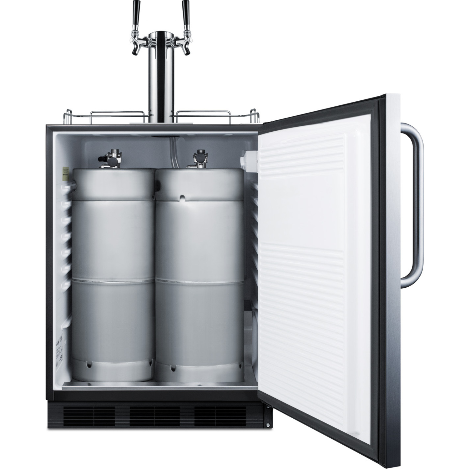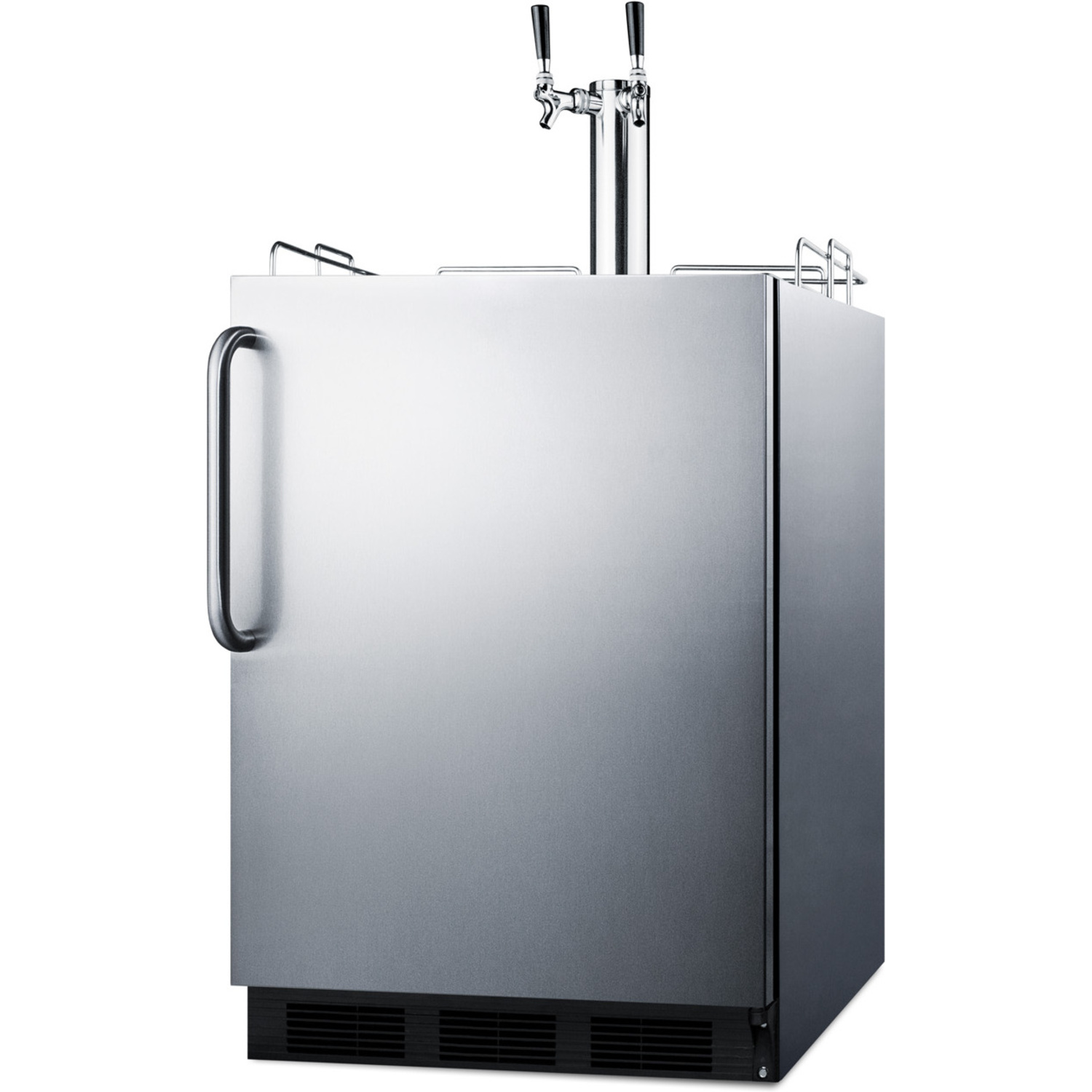 Sized at 32"es high, the SBC54OSBIADA is designed to fit under lower ADA compliant counters. The front-breathing design allows built-in installation, while the fully finished cabinet also enables freestanding use. This unit comes with a weatherproof 304 grade stainless steel wrapped cabinet and door, complete with a pro style towel bar handle. We include a guard rail and two-piece stainless steel drip tray for cleaner service. The SBC54OSBIADA ships with a complete Sankey American dual tap kit complete with a draft tower, regulator, 5 lb. CO2 tank, and all the equipment you need to serve beer on tap.
