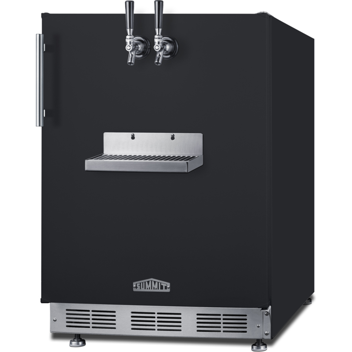 Sized with a 24" footprint, model SBC58BFRTP is a versatile front tap beer dispenser that is ETL-S listed to NSF-7 standards for use in commercial environments. The design also meets residential standards for home use. Adjustable legs allow you to set the height between 32.5" and 34.5" for the perfect fit. A leg shield is included for optional use if there is too much space between the front and the floor. It comes in a jet black finish with stainless steel accents. This kegerator can be built-in under counters or used freestanding.