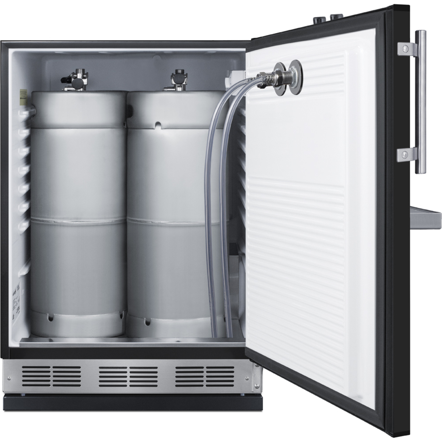 The SBC58BFRTP is unique because the twin taps are accessed via the unit's front door. The specialized design frees up valuable counter space in kitchens, home bars, and eateries with limited room. The kegerator can be installed under a counter without the need to modify the countertop with a hole for the draft tower. The front tap system also creates a more accessible kegerator experience. This kegerator ships fully assembled and includes a removable stainless steel drip tray that mounts on the door below the taps. The SBC58BFRTP's commercial grade tower has two faucets serving beer from two 1/6 (sixtel) kegs. We also include a CO2 tank, regulator, and all the equipment you need to confidently serve perfectly chilled beer on tap.