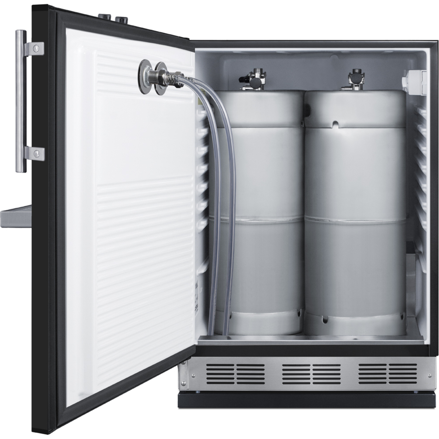 The SBC58BFRTPLHD is unique because the twin taps are accessed via the unit's front door. The specialized design frees up valuable counter space in kitchens, home bars, and eateries with limited room. The kegerator can be installed under a counter without the need to modify the countertop with a hole for the draft tower. The front tap system also creates a more accessible kegerator experience. This kegerator ships fully assembled and includes a removable stainless steel drip tray that mounts on the door below the taps. The SBC58BFRTP's commercial grade tower has two faucets serving beer from two 1/6 (sixtel) kegs. We also include a CO2 tank, regulator, and all the equipment you need to confidently serve perfectly chilled beer on tap.