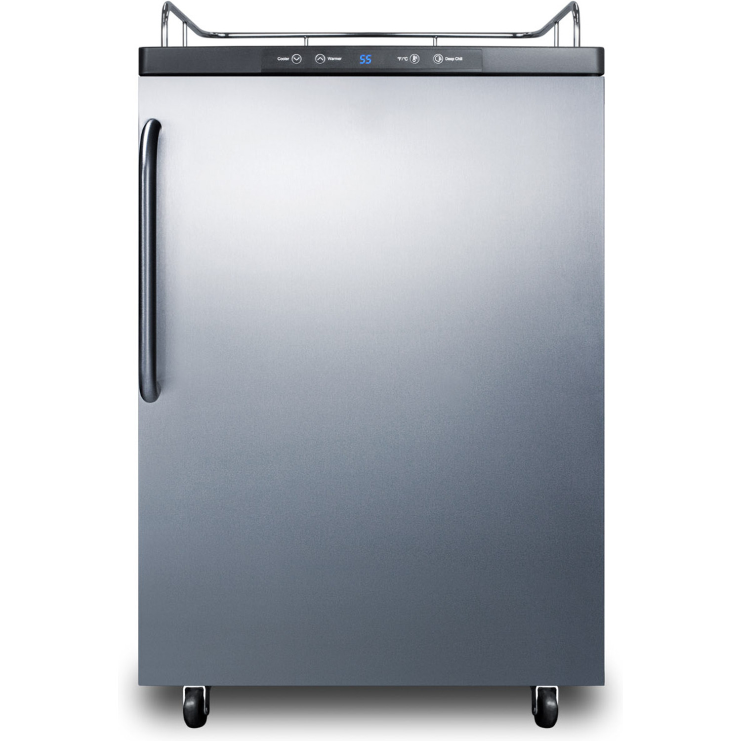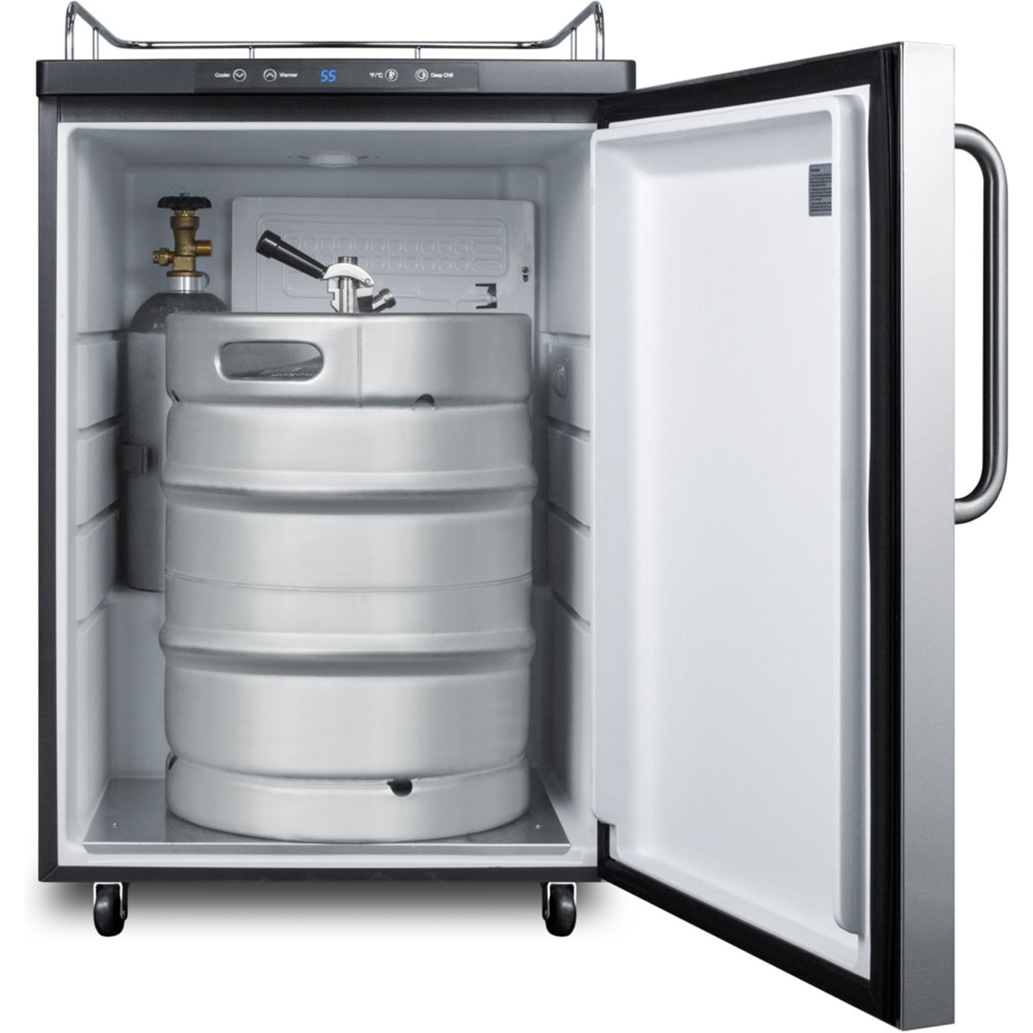 The SBC635MNKSSTB features a large interior that can hold a full half, quarter, 1/6 or mini keg. No tapping equipment is included, allowing 'do-it-yourselfers' to customize the unit with their own system. It comes with a black cabinet and stainless steel wrapped door complete with a professional style towel bar handle. The surface includes a removable drip tray to collect spills and a chrome guard rail to help keep glasses and mugs in place. We include a set of locking casters for easy mobility.