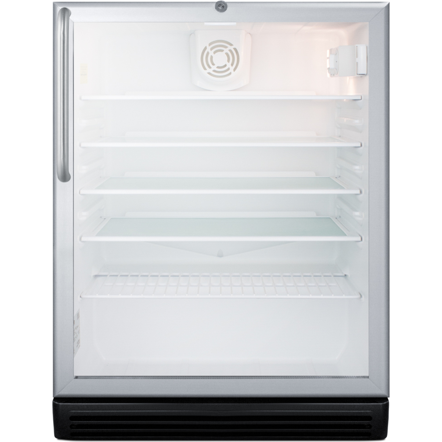 Inside, the SCR600BGLCSSADA includes four adjustable glass shelves for spill-proof storage and a half-sized wire shelf ideal for holding bottles in place. Automatic defrost ensures minimum user maintenance and a dial thermostat makes it simple to manage the temperature. This unit features an interior light operated with an ON/OFF rocker switch and a white interior finish to ensure optimum product visibility. Our unique "hidden" evaporator is located in the rear wall to help protect the unit's system and maximize shelf space. An internal fan helps to ensure the interior is more evenly cooled from top to bottom.