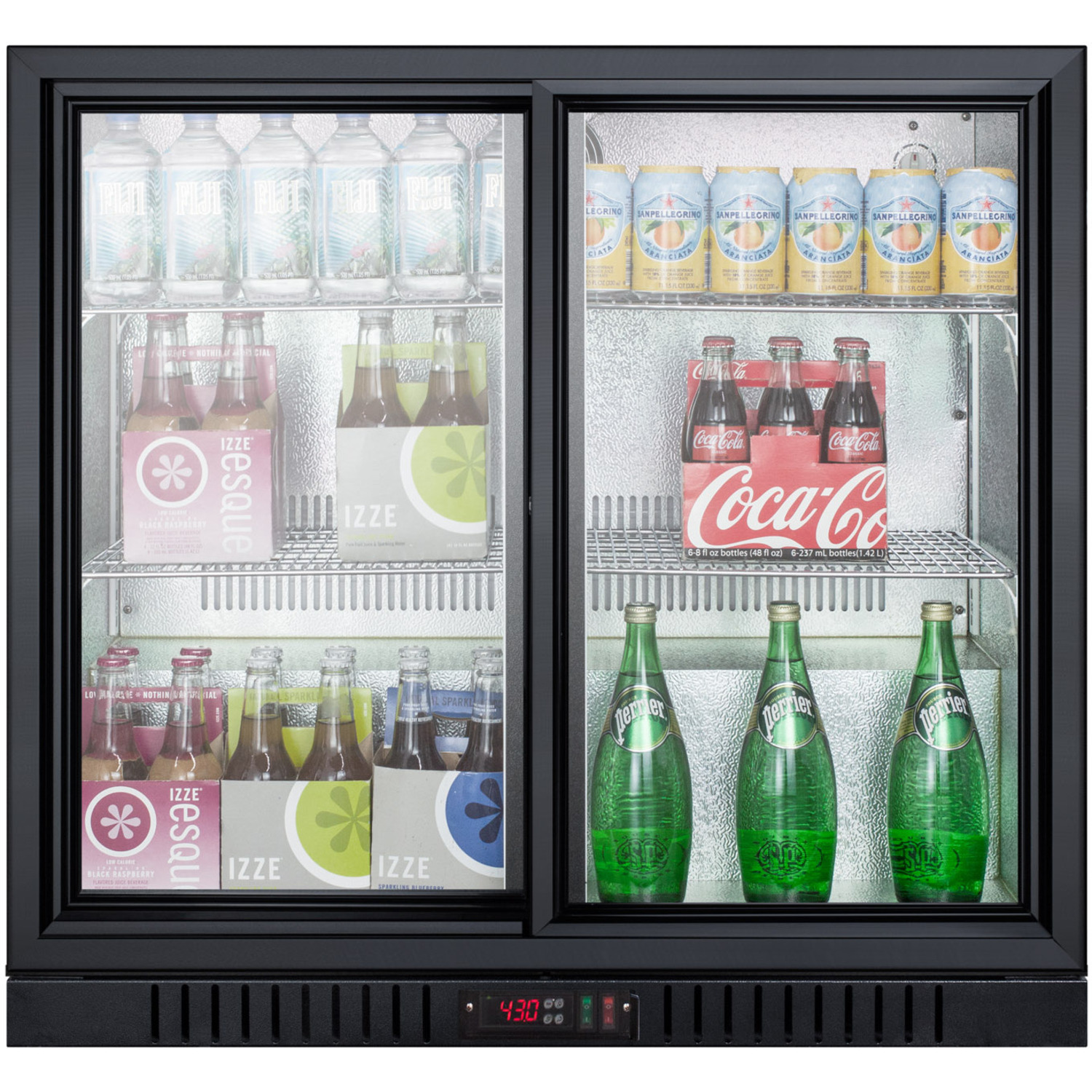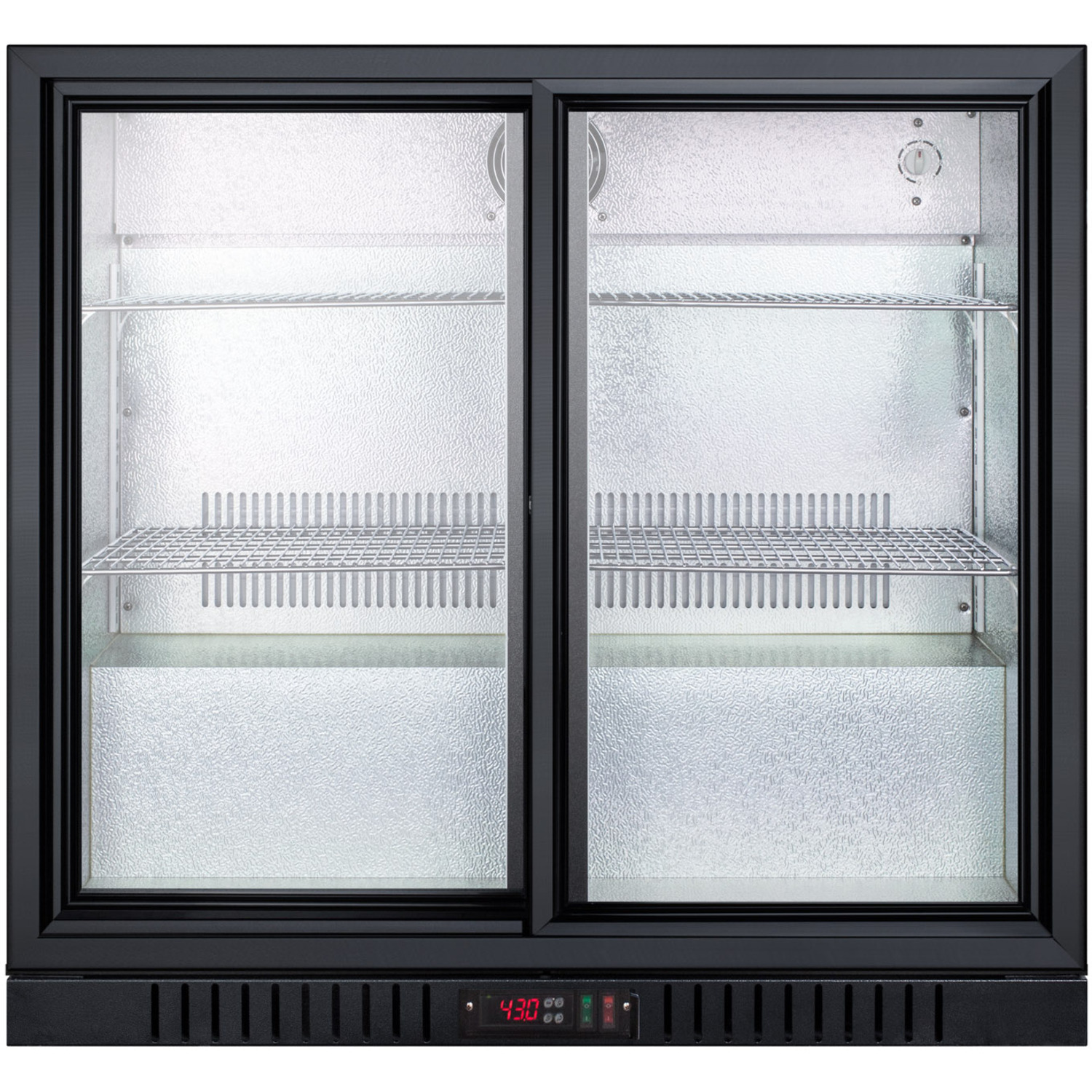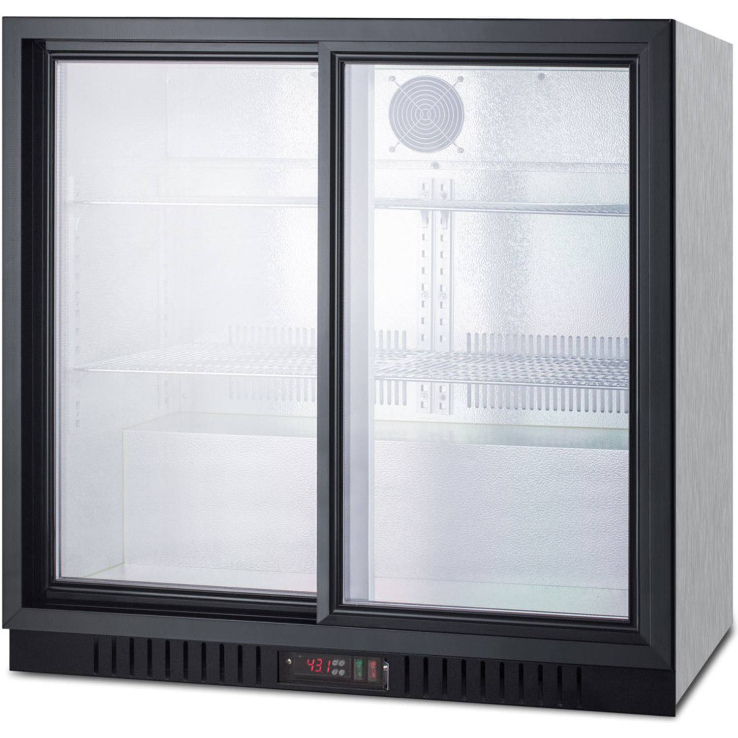 This commercially approved refrigerator utilizes automatic defrost for low maintenance use. Two sliding glass doors offer a full view inside the 7.4 cu.ft. hammered aluminum interior, with interior lighting for added product visibility and fan-forced cooling to help improve temperature distribution. Adjustable chrome shelves allow you to rearrange storage to accommodate a variety of sizes. This unit includes a factory installed lock for added security and a digital thermostat for easy temperature management.