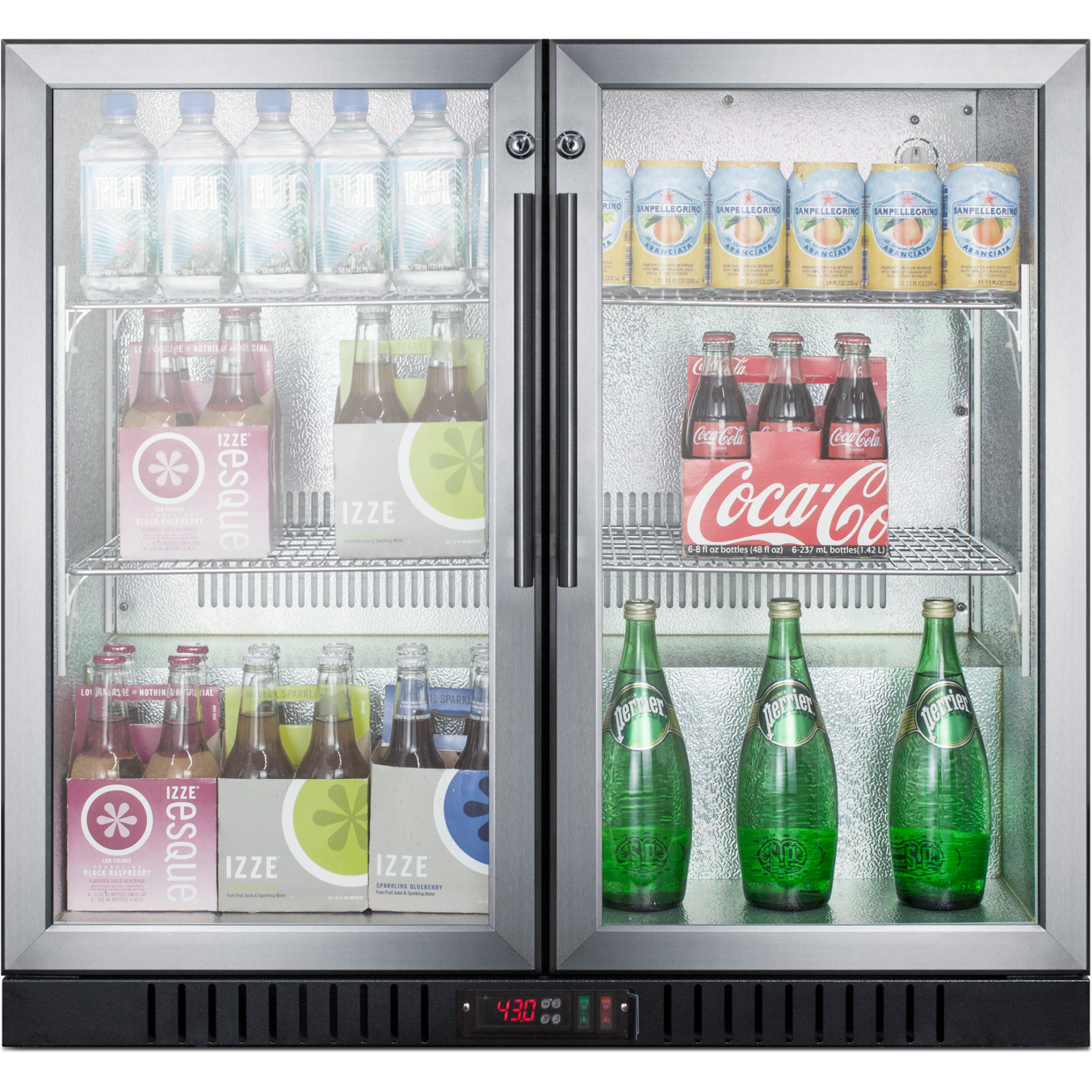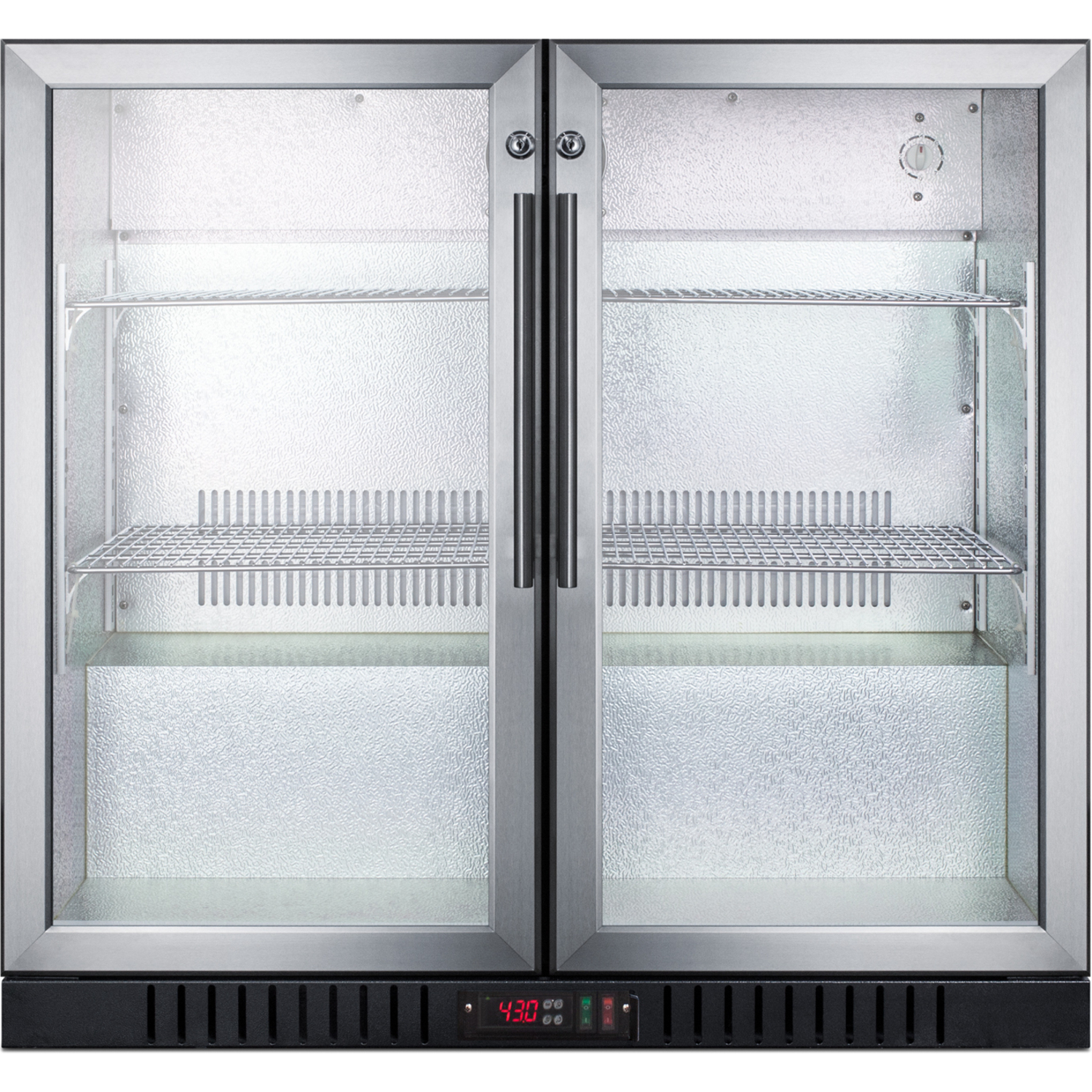 Two solid glass doors are trimmed with stainless steel and equipped with front-mounted locks for added security. Both are self-closing to help ensure stored items aren't accidentally left exposed to room temperature. Stainless steel handles complete the professional look. This unit comes in a stainless steel wrapped exterior cabinet.