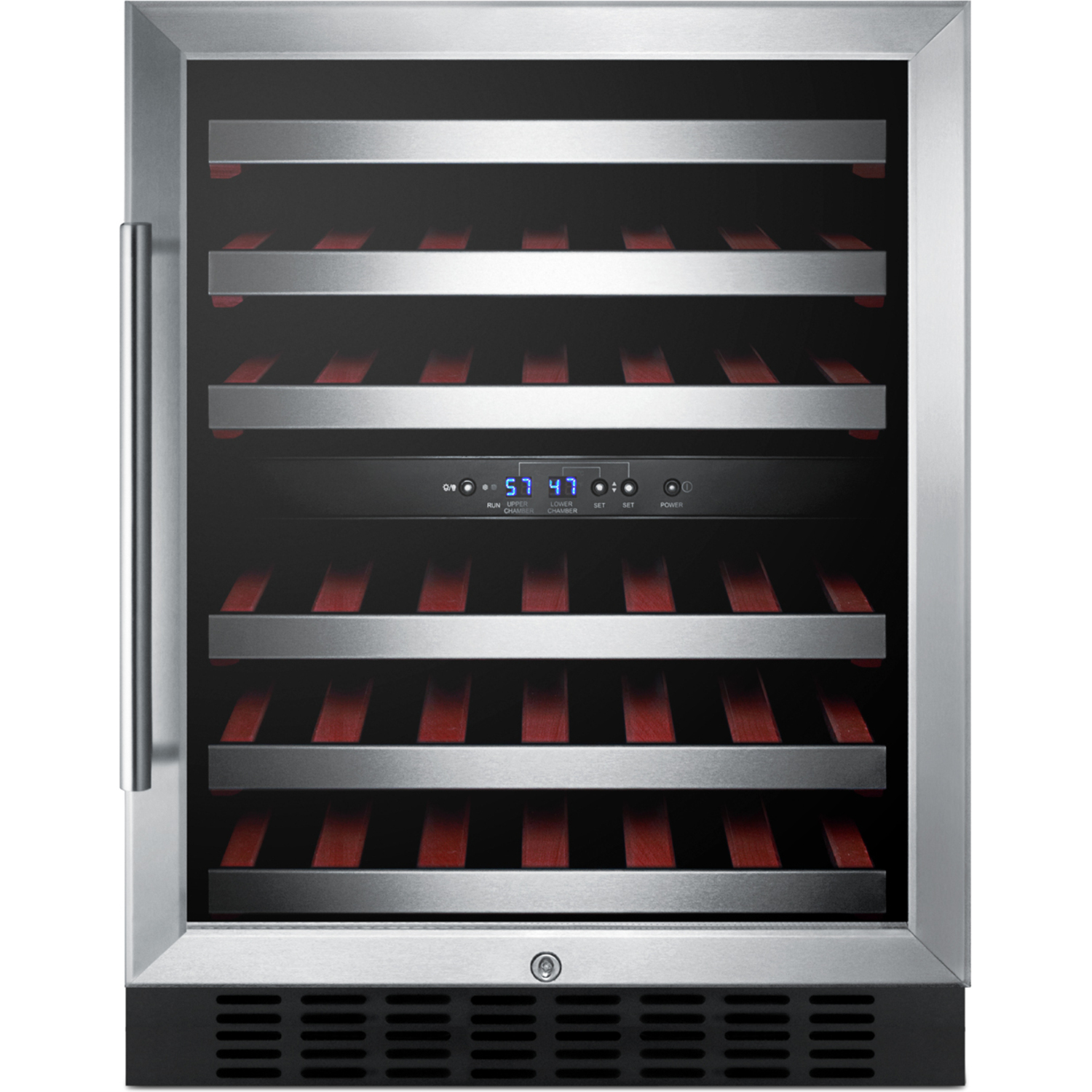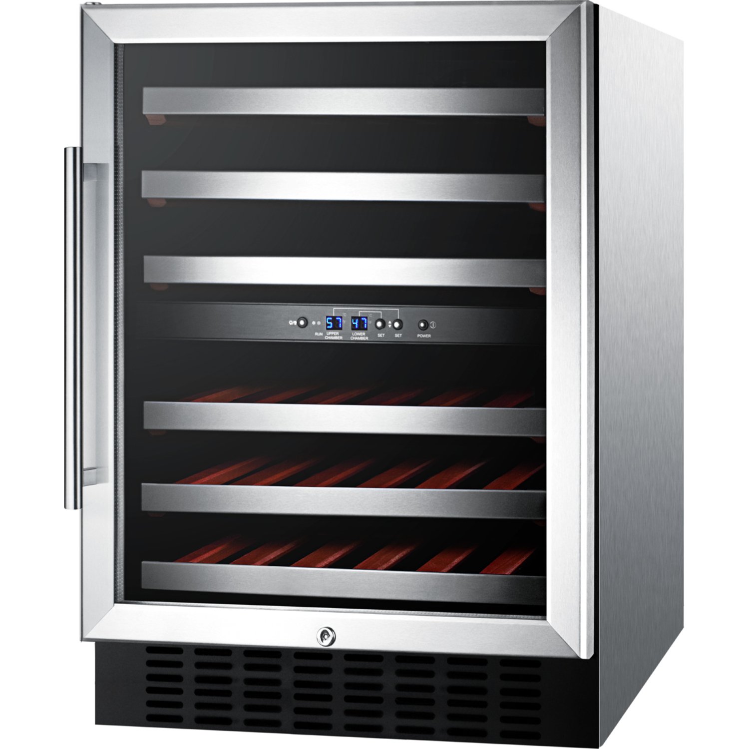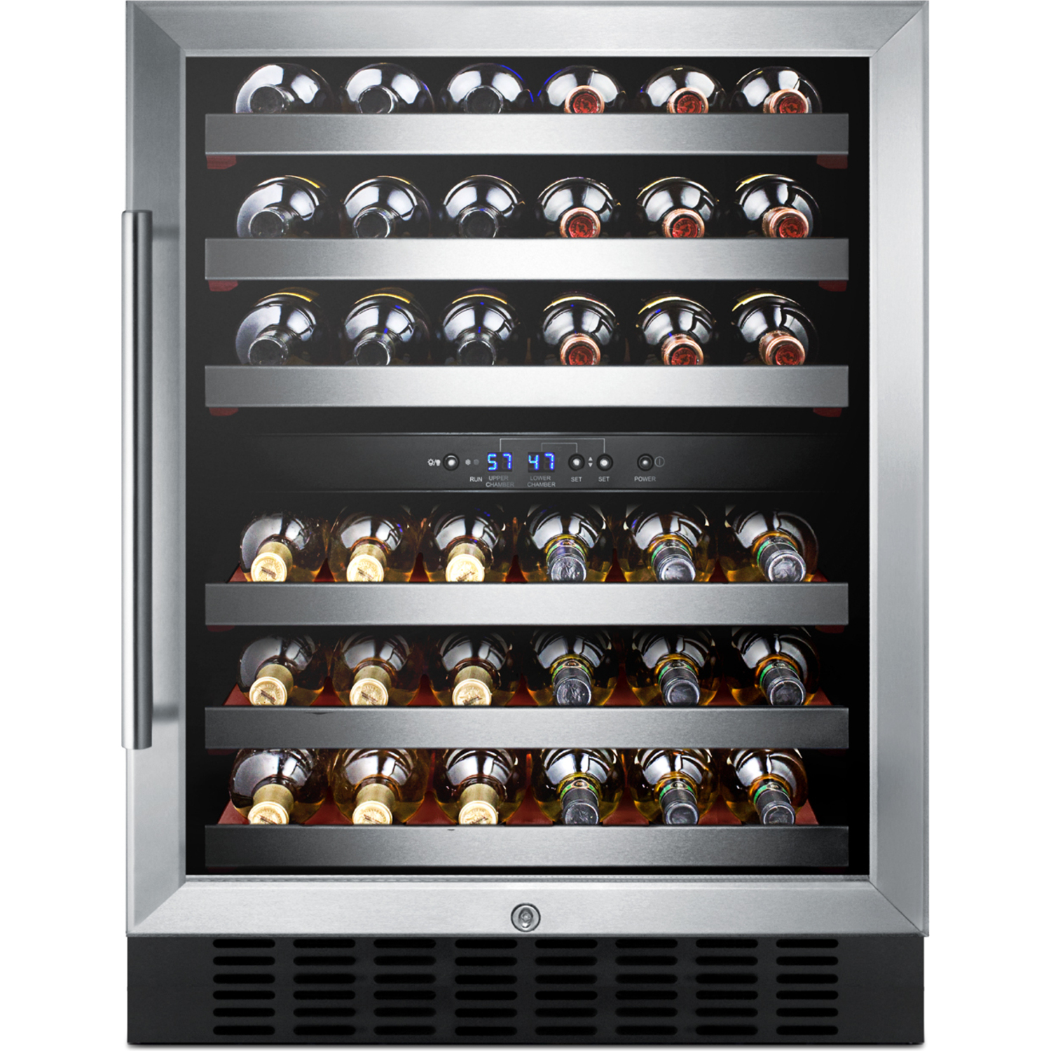 Two digital thermostats allow you to chill your white wine while separately preserving red at a warmer temperature. Slide-out wooden shelves with stainless steel trim let you store up to 46 standard 750ml sized Bordeaux bottles. Alternatively, you can store up to 40 bottles of the wider Pinot Noir or Chardonnay bottles, while still fitting an additional six Bordeaux bottles. Full automatic defrost, interior lighting, and SUMMIT's own "hidden" evaporator help to keep use and maintenance simple.