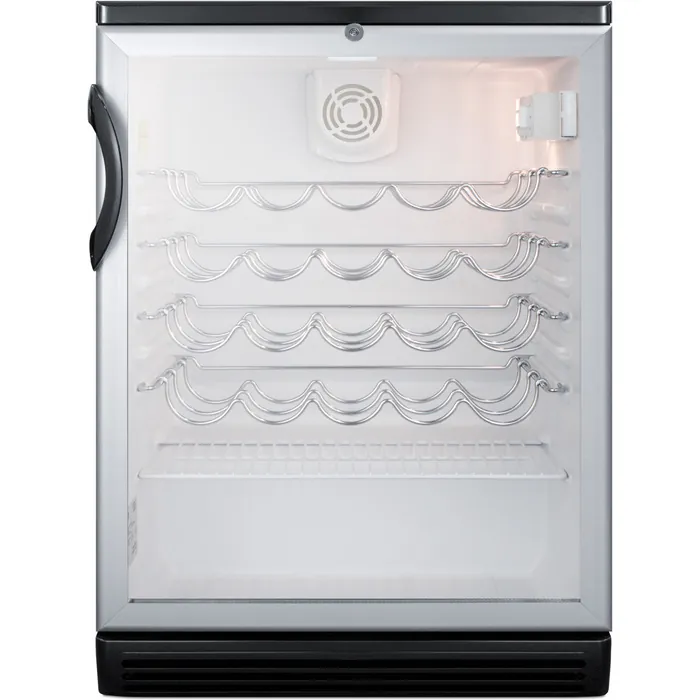The counter height SWC6GBL is just under 24" wide for an easy fit in tight settings, with a finished black cabinet for freestanding use and an aluminum trimmed reversible glass door for a stylish display. A factory lock offers keyed security.