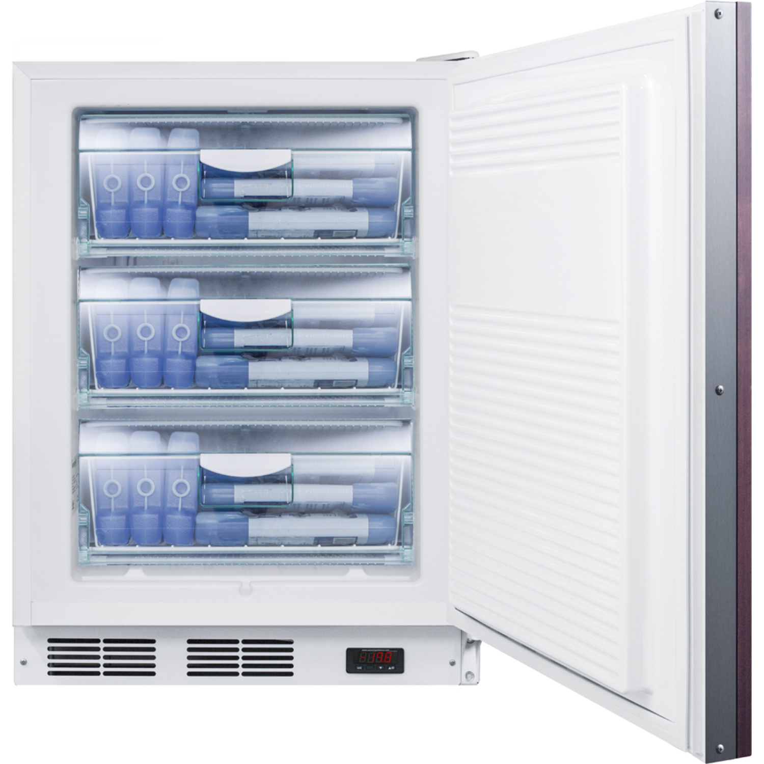 The 32” high VT65MLBIIFADA can be used built-in or freestanding in any 24” space, with low temperature manual defrost operation that can reach -25ºC. The interior includes three slide-out basket drawers for convenient storage that keeps items cold when the door is opened. Additional features include an adjustable thermostat and one-piece interior liner for easier cleanup.