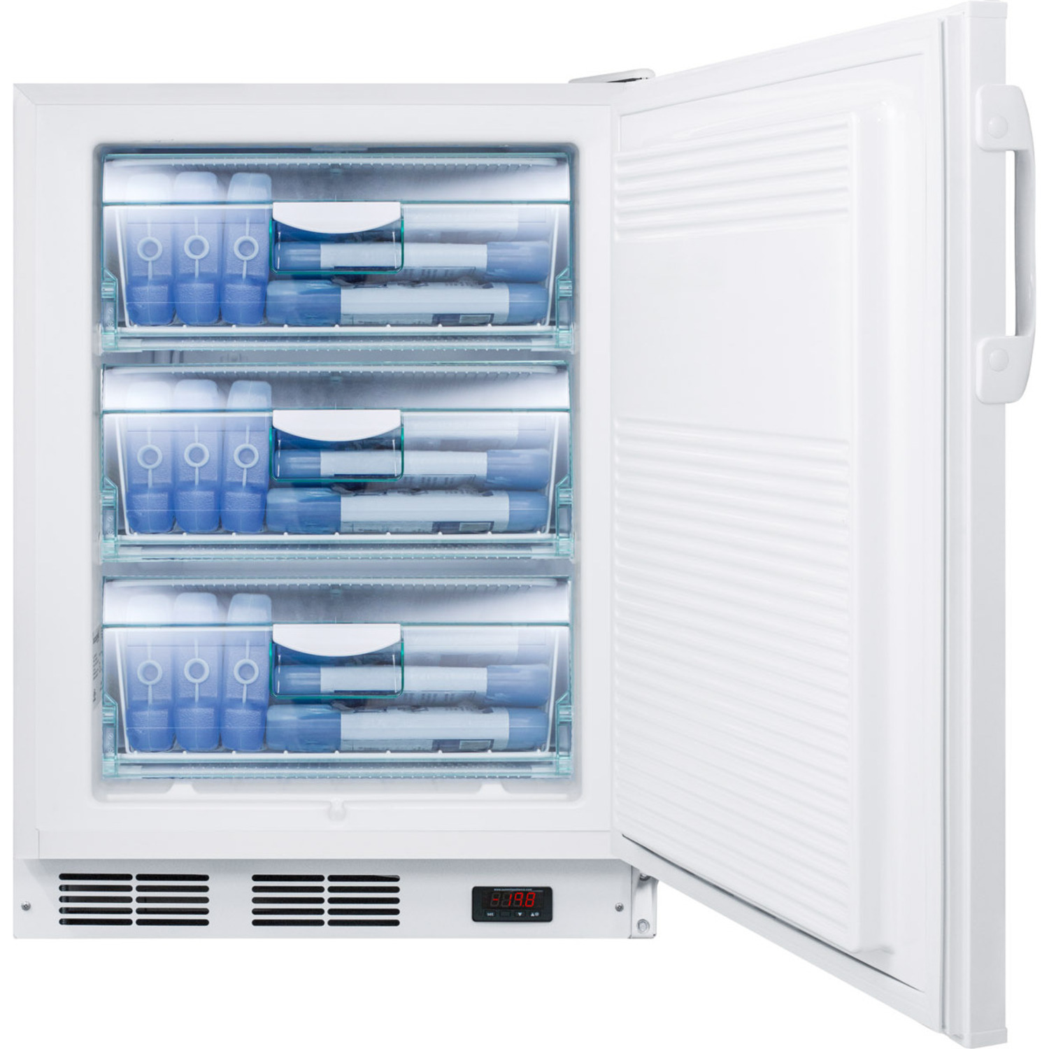 The VT65MLBIPLUS2ADA is a 24” wide all-freezer designed for built-in use under ADA compliant counters, with a factory installed lock for added security and a digital thermostat for easy temperature control. This manual defrost unit can hold temperatures as low as -25ºC, ideal for many vaccines and laboratory items. The door includes a thermometer calibrated to NIST standards in our ISO/IEC 17025:2017 laboratory. It displays the current, minimum, and maximum temperature to the nearest tenth degree viewable in Celsius or Fahrenheit. The buffered temperature probe is stored in a glycol-filled bottle to ensure the temperature reading best reflects the temperature of other stored freezer contents. The interior features three removable storage baskets with clear plastic fronts for easy storage that stays cold, even when the door is opened.