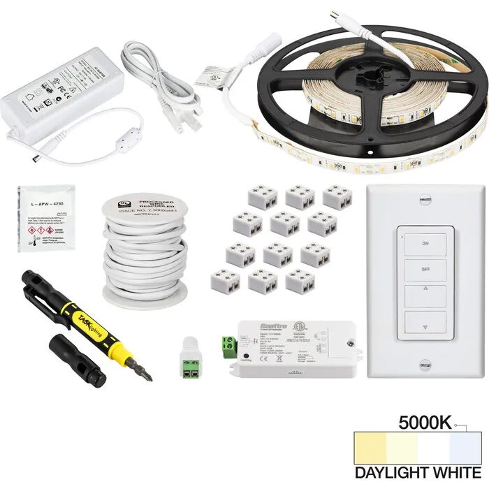 Everything needed to install 1 zone and 1 area of 16 ft of 12-Volt 120 Lumens/Ft Single-White LED Tape Lighting with a one-zone wireless controller in one box. Contains one 16 ft roll of 12-Volt 120 Lumens/Ft Single-White LED Tape Lighting, two 6-packs of 8 mm EZ Connectors, one plug-in 24W power supply, 25 ft connection wire, one-zone wireless controller, one wireless receiver, screwdriver, adhesive promoter wipe. Cut the tape light to length to achieve beautiful, even lighting in any space. Easily expand with expansion packs, sold separately. IP65 Waterproof rated tape light. Field cut at 2" cut lines. On/off/dim functionality with included touch dimmer switch. Plug-in power supplies allow for installation without an electrician.18 diodes per foot (300 per roll) create even illuminationUL Listed or recognized components to keep inspectors satisfied90+ CRI tape light for true rather than faded colors30,000 hour LED life at 70% lumen maintenance means long-lasting illumination3M 300LSE waterproof adhesive tape for improved adhesive to surfaces, plus adhesive promotor surface preparation wipe includedKit expansions and aluminum housings available, ordered separatelyDimmable with included wireless controller and receivers