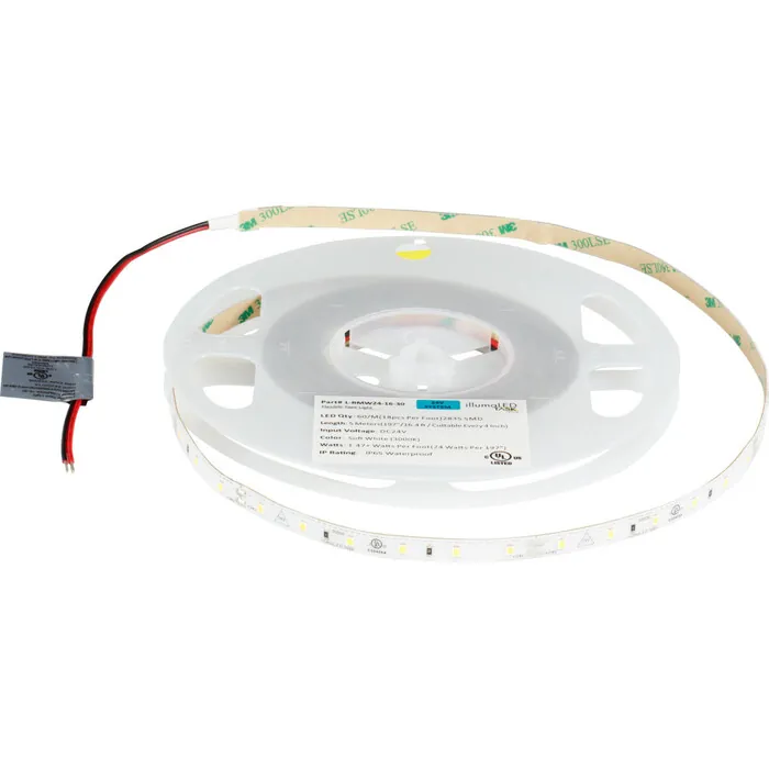 24-Volt 120 Lumens/Ft Single-White LED Tape Lighting is only 8 mm wide, and comes with 3M Ultra Bond double-stick tape for a peel-and-stick installation. Perfect for under and above cabinet, in ceiling cove, under a vanity, or wherever a low maintenance light is needed. IP65 Waterproof rating means this tape light is suitable for damp and wet locations. Consumes 1.5 watts per foot, but can be field cut at 4" cut lines. Dimmable with compatible dimmer. Use with remote power supply, ordered separately.18 diodes per foot (300 per roll) create even illuminationUL Listed to keep inspectors satisfied90+ CRI for true rather than faded colors30,000 hour LED life at 70% lumen maintenance means long-lasting illumination3M 300LSE waterproof adhesive tape for improved adhesive to surfacesAluminum housings available, ordered separatelyDimmable with compatible dimmer