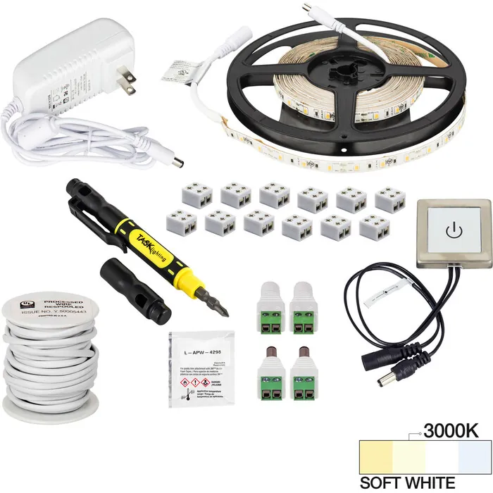 Task Lighting 16 Ft., 120 Lumens/Ft. 12-volt Accent Output Touch Dimmer Switch Tape Light Kit, Single-White, SoFt. White 3000K, 840002546720, L-RTDK-16-30