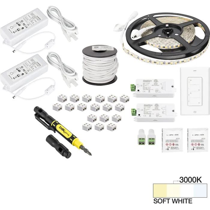 Everything needed to install 2 zones and 2 areas of 16 ft of 12-Volt 225 Lumens/Ft Single-White LED Tape Lighting with a two-zone wireless controller in one box. Contains 16 ft roll of 12-Volt 225 Lumens/Ft Single-White LED Tape Lighting with 3M Ultra Bond double-stick tape for peel-and-stick installation, three 6-packs of 8 mm EZ Connectors, two plug-in 60W power supplies, 50ft connection wire, two-zone wireless controller, two wireless receivers, screwdriver, adhesive promoter wipe. Cut the tape light to length to achieve beautiful, even lighting in any space. Easily expand with expansion packs, sold separately.38 diodes per foot (600 per roll) create even illuminationUL Listed or recognized components to keep inspectors satisfied90+ CRI tape light for true rather than faded colors30,000 hour LED life at 70% lumen maintenance means long-lasting illumination3M 300LSE waterproof adhesive tape for improved adhesive to surfaces, plus adhesive promotor surface preparation wipe includedKit expansions and aluminum housings available, ordered separatelyDimmable with included wireless controller and receivers
