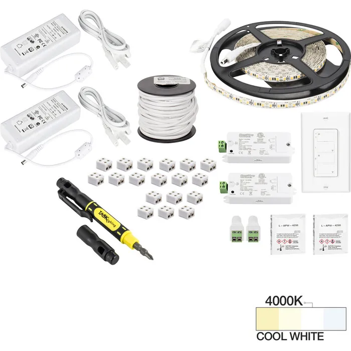 Everything needed to install 2 zones and 2 areas of 16 ft of 12-Volt 225 Lumens/Ft Single-White LED Tape Lighting with a two-zone wireless controller in one box. Contains 16 ft roll of 12-Volt 225 Lumens/Ft Single-White LED Tape Lighting with 3M Ultra Bond double-stick tape for peel-and-stick installation, three 6-packs of 8 mm EZ Connectors, two plug-in 60W power supplies, 50ft connection wire, two-zone wireless controller, two wireless receivers, screwdriver, adhesive promoter wipe. Cut the tape light to length to achieve beautiful, even lighting in any space. Easily expand with expansion packs, sold separately.37 diodes per foot (600 per roll) create even illuminationUL Listed or recognized components to keep inspectors satisfied90+ CRI tape light for true rather than faded colors30,000 hour LED life at 70% lumen maintenance means long-lasting illumination3M 300LSE waterproof adhesive tape for improved adhesive to surfaces, plus adhesive promotor surface preparation wipe includedKit expansions and aluminum housings available, ordered separatelyDimmable with included wireless controller and receivers