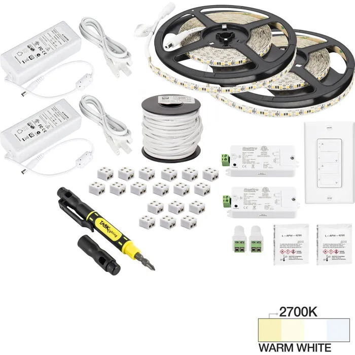 Everything needed to install 2 zones and 2 areas of 32 ft of 12-Volt 225 Lumens/Ft Single-White LED Tape Lighting with a two-zone wireless controller in one box. Contains two 16 ft rolls of 12-Volt 225 Lumens/Ft Single-White LED Tape Lighting (32 ft total) with 3M Ultra Bond double-stick tape for peel-and-stick installation, three 6-packs of 8 mm EZ Connectors, two plug-in 60W power supplies, 50ft connection wire, two-zone wireless controller, two wireless receivers, screwdriver, adhesive promoter wipe. Cut the tape light to length to achieve beautiful, even lighting in any space. Easily expand with expansion packs, sold separately.36 diodes per foot (600 per roll) create even illuminationUL Listed or recognized components to keep inspectors satisfied90+ CRI tape light for true rather than faded colors30,000 hour LED life at 70% lumen maintenance means long-lasting illumination3M 300LSE waterproof adhesive tape for improved adhesive to surfaces, plus adhesive promotor surface preparation wipe includedKit expansions and aluminum housings available, ordered separatelyDimmable with included wireless controller and receivers