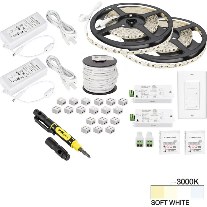Everything needed to install 2 zones and 2 areas of 32 ft of 12-Volt 225 Lumens/Ft Single-White LED Tape Lighting with a two-zone wireless controller in one box. Contains two 16 ft rolls of 12-Volt 225 Lumens/Ft Single-White LED Tape Lighting (32 ft total) with 3M Ultra Bond double-stick tape for peel-and-stick installation, three 6-packs of 8 mm EZ Connectors, two plug-in 60W power supplies, 50ft connection wire, two-zone wireless controller, two wireless receivers, screwdriver, adhesive promoter wipe. Cut the tape light to length to achieve beautiful, even lighting in any space. Easily expand with expansion packs, sold separately.36 diodes per foot (600 per roll) create even illuminationUL Listed or recognized components to keep inspectors satisfied90+ CRI tape light for true rather than faded colors30,000 hour LED life at 70% lumen maintenance means long-lasting illumination3M 300LSE waterproof adhesive tape for improved adhesive to surfaces, plus adhesive promotor surface preparation wipe includedKit expansions and aluminum housings available, ordered separatelyDimmable with included wireless controller and receivers