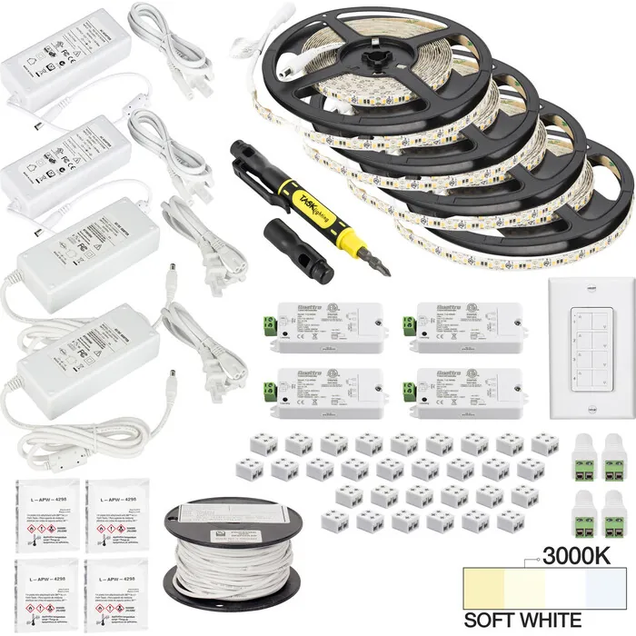 Everything needed to install 4 zones and 4 areas of 65 ft of 12-Volt 225 Lumens/Ft Single-White LED Tape Lighting with a four-zone wireless controller in one box. Contains four 16 ft rolls of 12-Volt 225 Lumens/Ft Single-White LED Tape Lighting (65 ft total) with 3M Ultra Bond double-stick tape for peel-and-stick installation, four 6-packs of 8 mm EZ Connectors, two plug-in 60W power supplies, two plug-in 96W power supplies, 100 ft connection wire, four-zone wireless controller, four wireless receivers, screwdriver, adhesive promoter wipe. Cut the tape light to length to achieve beautiful, even lighting in any space. Easily expand with expansion packs, sold separately.36 diodes per foot (600 per roll) create even illuminationUL Listed or recognized components to keep inspectors satisfied90+ CRI tape light for true rather than faded colors30,000 hour LED life at 70% lumen maintenance means long-lasting illumination3M 300LSE waterproof adhesive tape for improved adhesive to surfaces, plus adhesive promotor surface preparation wipe includedKit expansions and aluminum housings available, ordered separatelyDimmable with included wireless controller and receivers